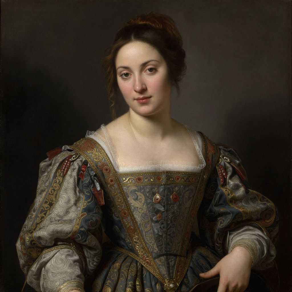 A classical oil painting reminiscent of Artemisia Gentileschi's style, depicting a serene portrait of a young woman adorned in Renaissance attire, featuring intricate details and soft, naturalistic lighting against a dark background.