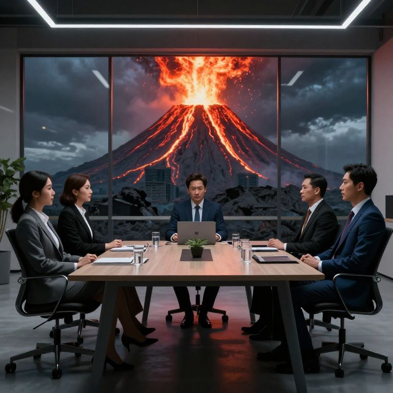 In a surreal tableau, a group of suited professionals convenes in a starkly modern office setting, their calm demeanor contrasting sharply with the apocalyptic backdrop of a violently erupting volcano, its fiery glow illuminating the room and casting an otherworldly hue over the scene.