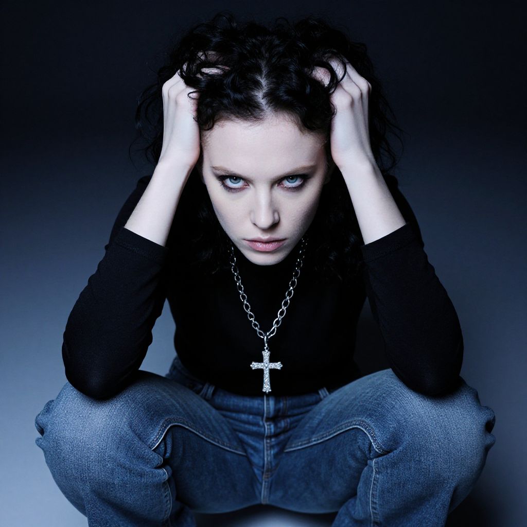 A high-contrast, blue-tinted photograph of a pale-skinned woman with dark, curly hair. She's crouching, hands in her hair, with intense, piercing eyes staring at the camera. She wears a black long-sleeve top and jeans, with a chunky chain necklace featuring a cross pendant. The background is a dark gradient, emphasizing her intense gaze and dramatic pose.