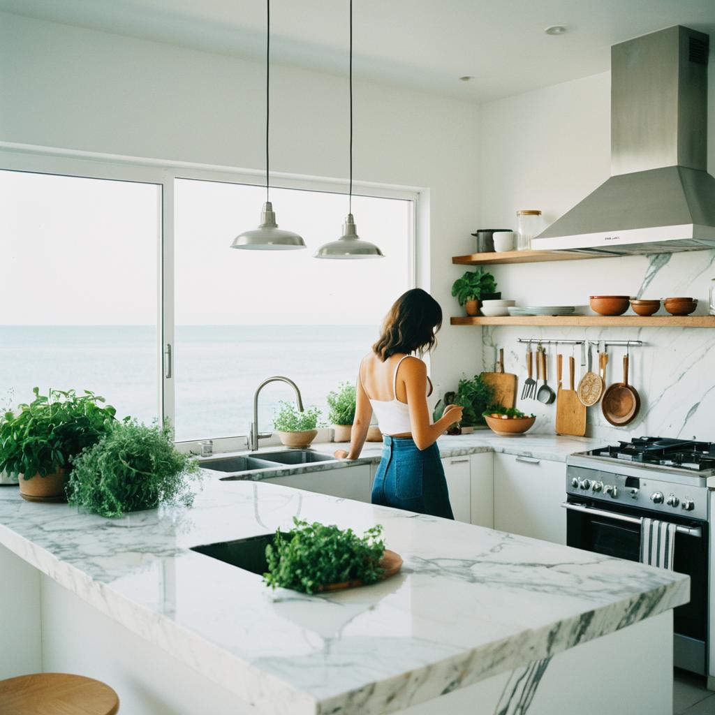 An minimalist Scandinavian living room, high-rise apartment, featuring stainless steel appliances, bar stools, pendant lighting, with sleek, realistic analog photography style, shot with medium format, Kodak Portra, femme fatale aesthetic, vibrant colors