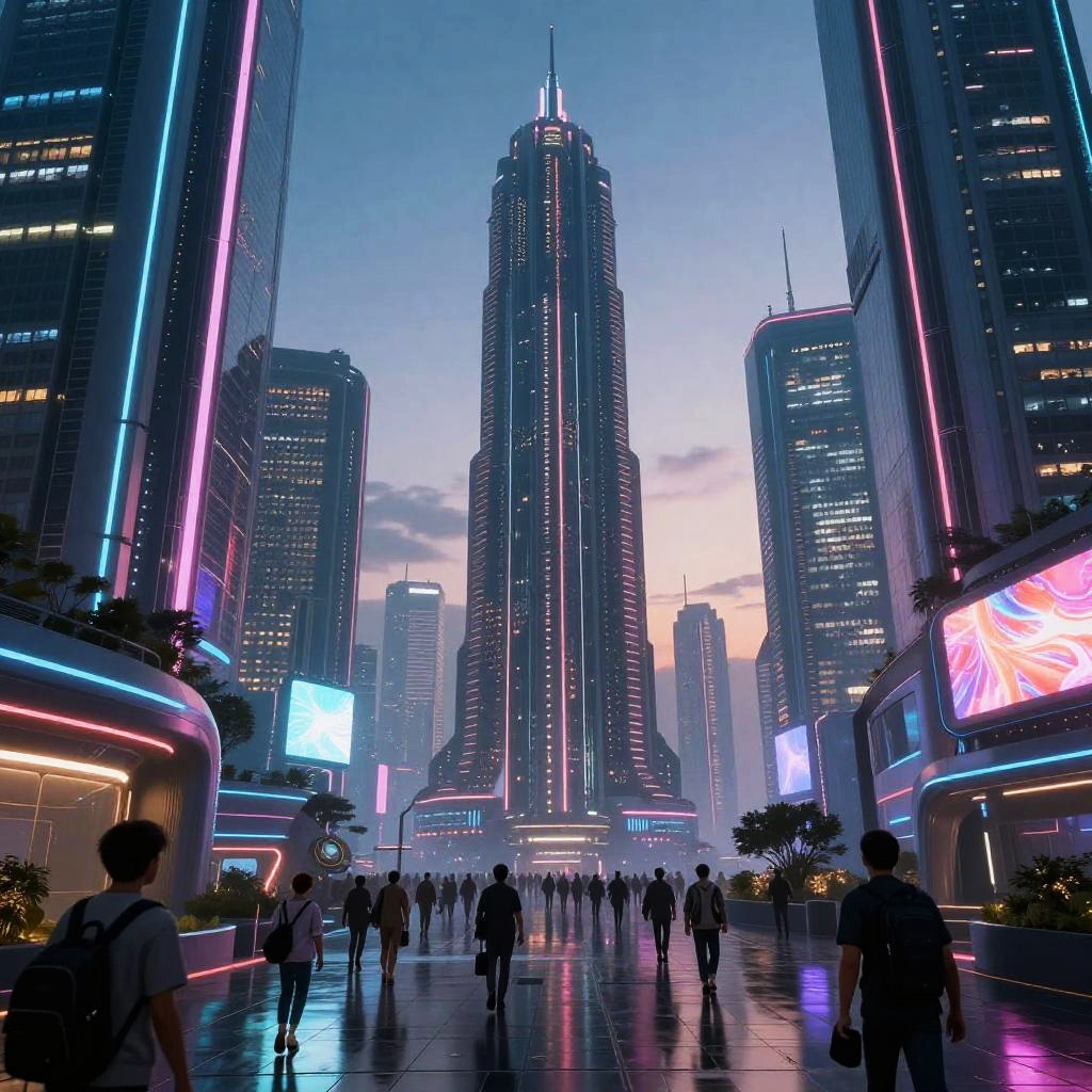 Zenless futuristic cityscape with sleek neon lights and towering skyscrapers, inspired by cyberpunk aesthetics, bustling with diverse characters and advanced technology under a twilight sky, emphasizing energetic yet serene vibes.