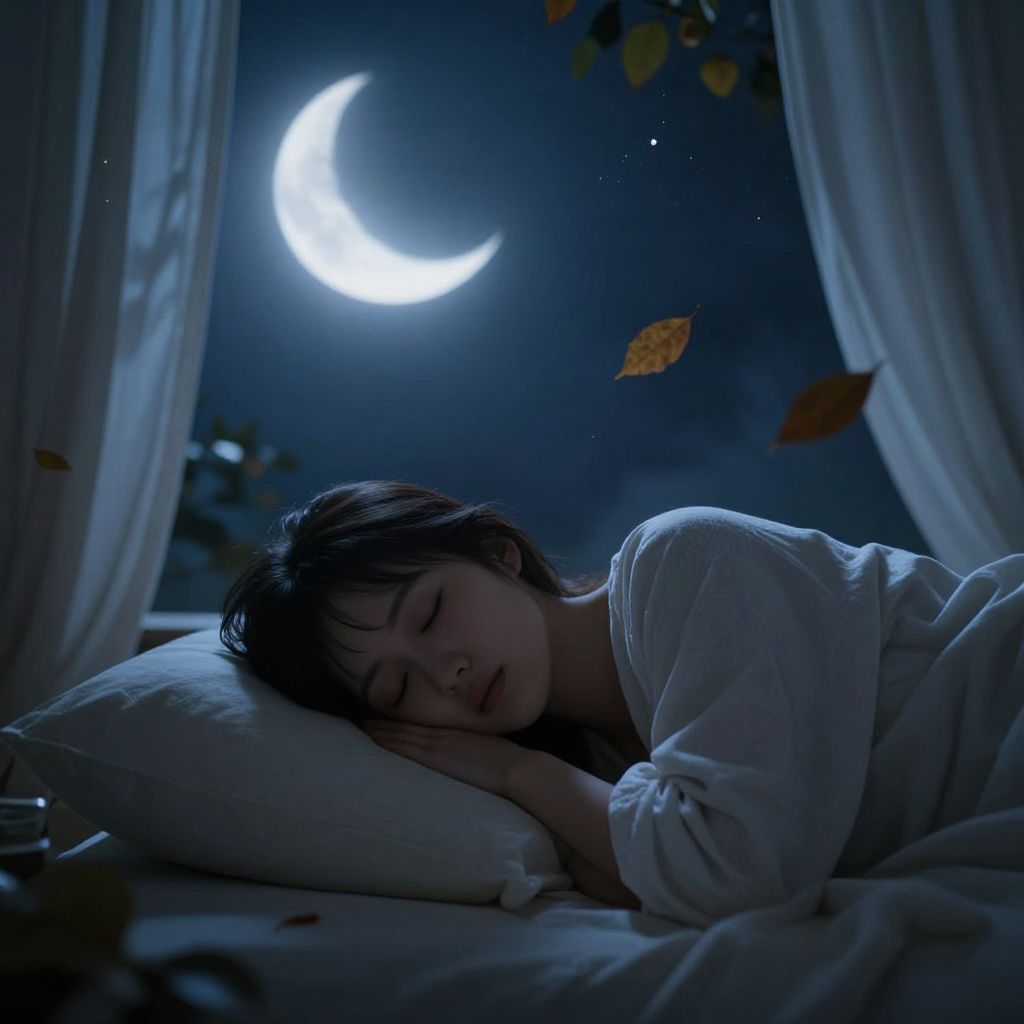Dreamy night scene featuring a woman peacefully sleeping under a crescent moon, surrounded by floating leaves and illuminated by soft moonlight streaming through a window.