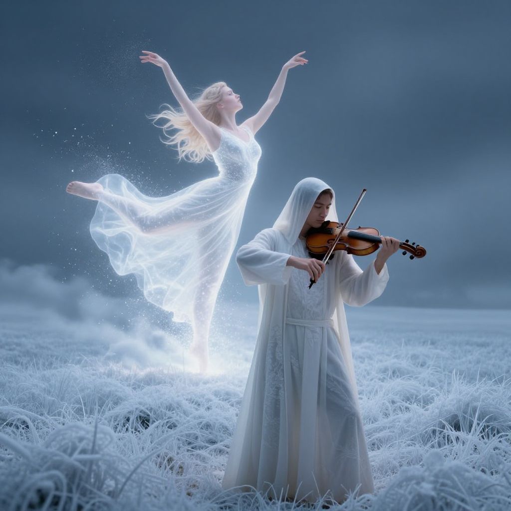 Enveloped in ethereal light, a cloaked figure intently plays a violin, conjuring a luminous, translucent woman who gracefully dances above a field of frosty clouds, her form dissolving into sparkling particles as she ascends.
