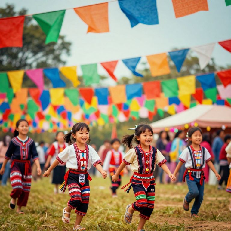 Toffee Artistic Photo, Asian Tribe, hanging coloured flags, focus on flags, happy people, kids running, funeral, celebration, pop colour, vivid, hdr, nostalgic, dreamy,