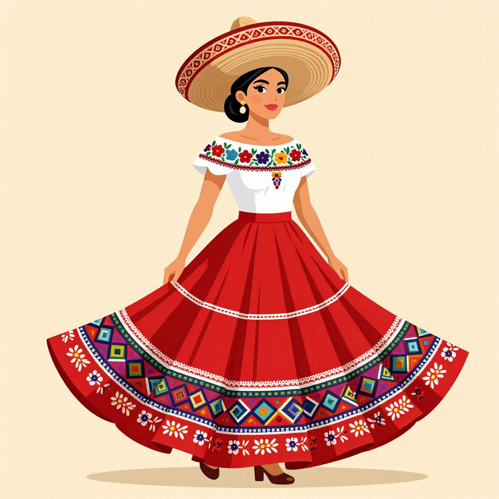 Digital illustration of a smiling Mexican woman in a white off-shoulder top, red skirt with colorful patterns, and sombrero, posing against a brown