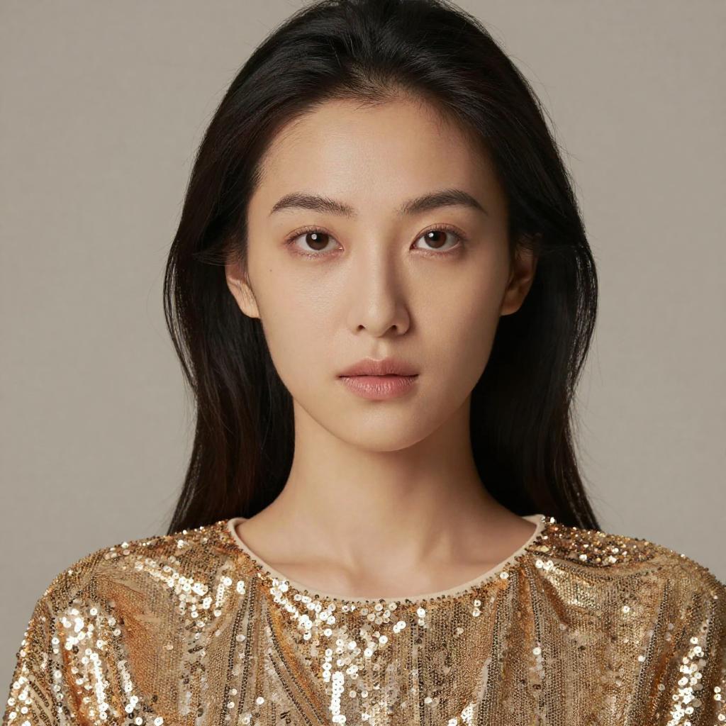 Close-up portrait of an Asian woman with long black hair wearing a shimmering gold sequin cape. She has brown eyes, natural makeup, and is looking directly at the camera against a neutral beige background. The lighting highlights the texture of the sequins and her smooth complexion.