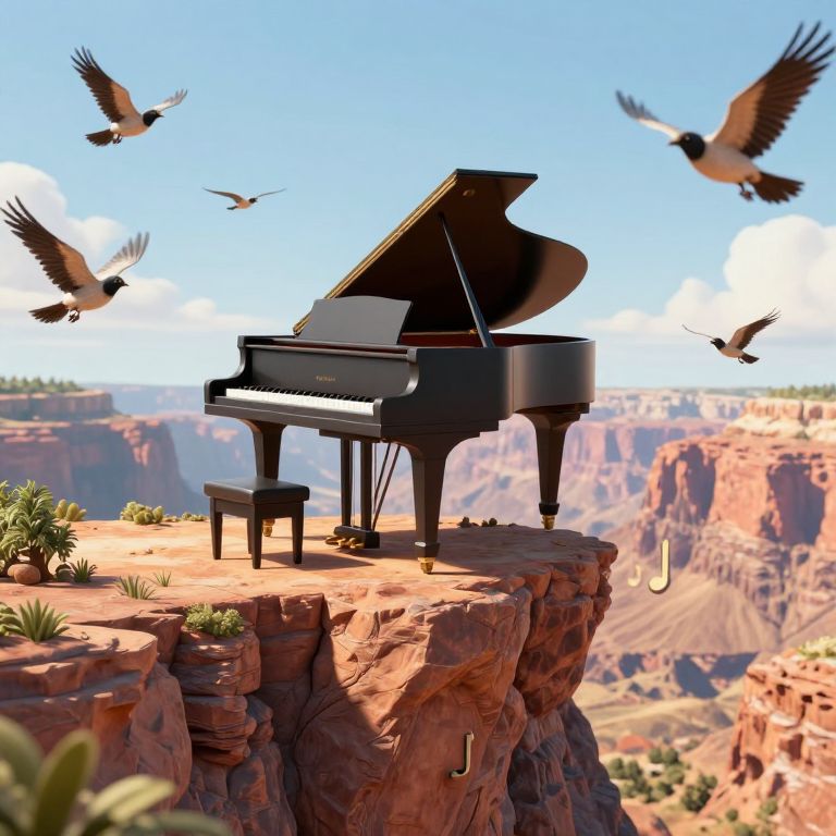 A surreal 3D-rendered scene depicts a grand piano perched precariously on the edge of a canyon, surrounded by birds in flight, evoking a dreamlike atmosphere where music and nature intertwine in a harmonious yet whimsical composition.