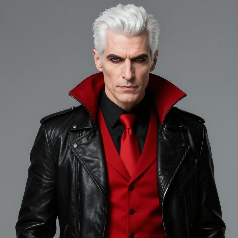 Graphics older male vampire with short white hair. Black Leather jacket with red accents. Red decorative vest. Black dress shirt. Red tie. 4k,