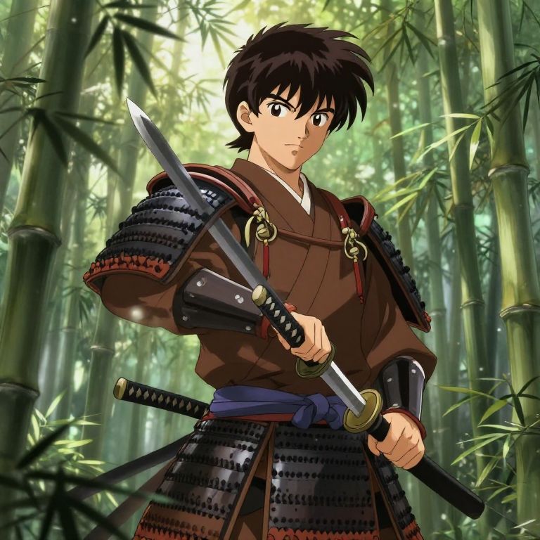 Anime-style illustration of a young samurai with black hair, wearing brown and black armor, holding a katana in a bamboo forest.