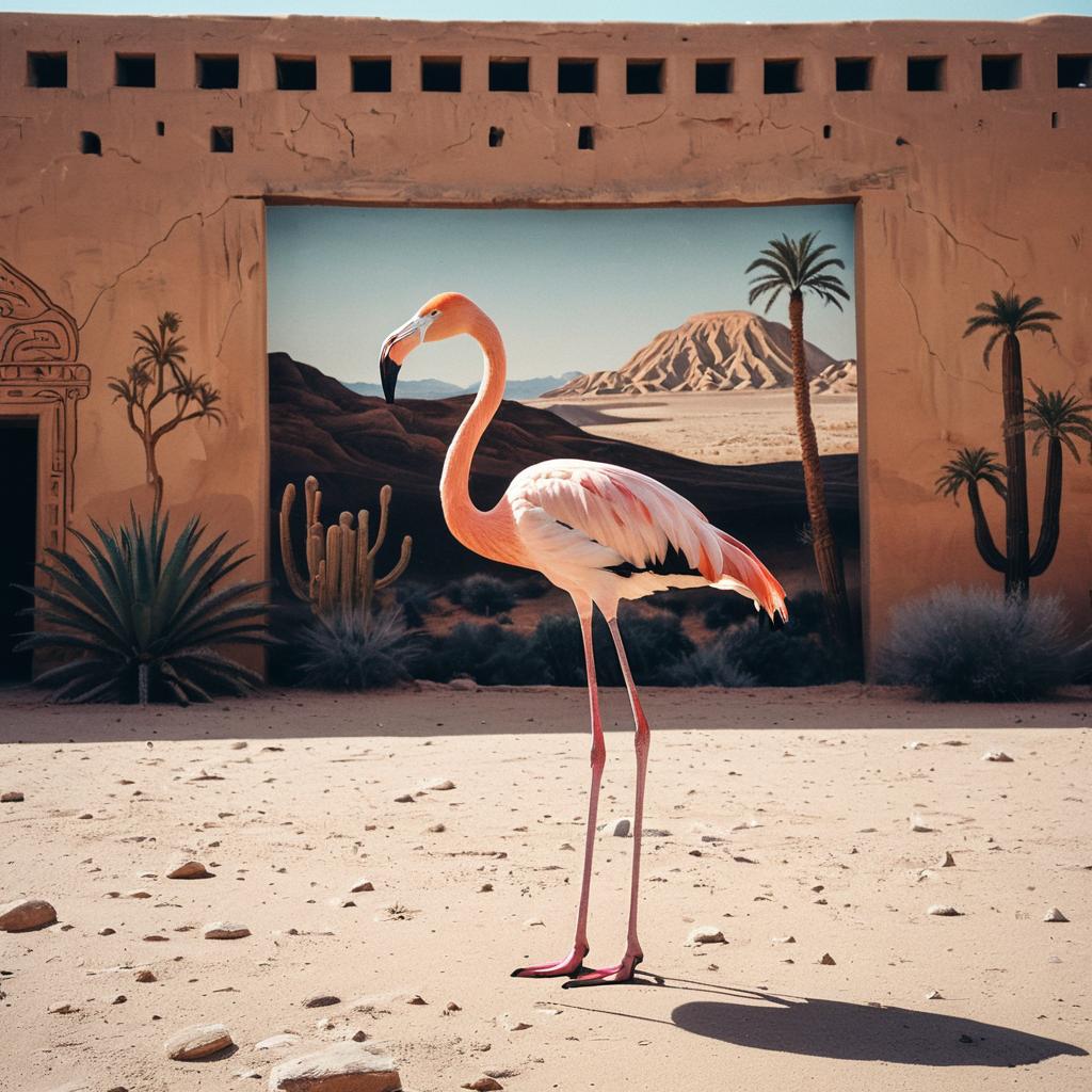 A solitary flamingo standing on sandy desert ground in front of adobe-style walls decorated with ancient desert murals. The murals depict desert landscapes and historic structures, imbued with a peaceful and dreamlike atmosphere under clear blue skies.