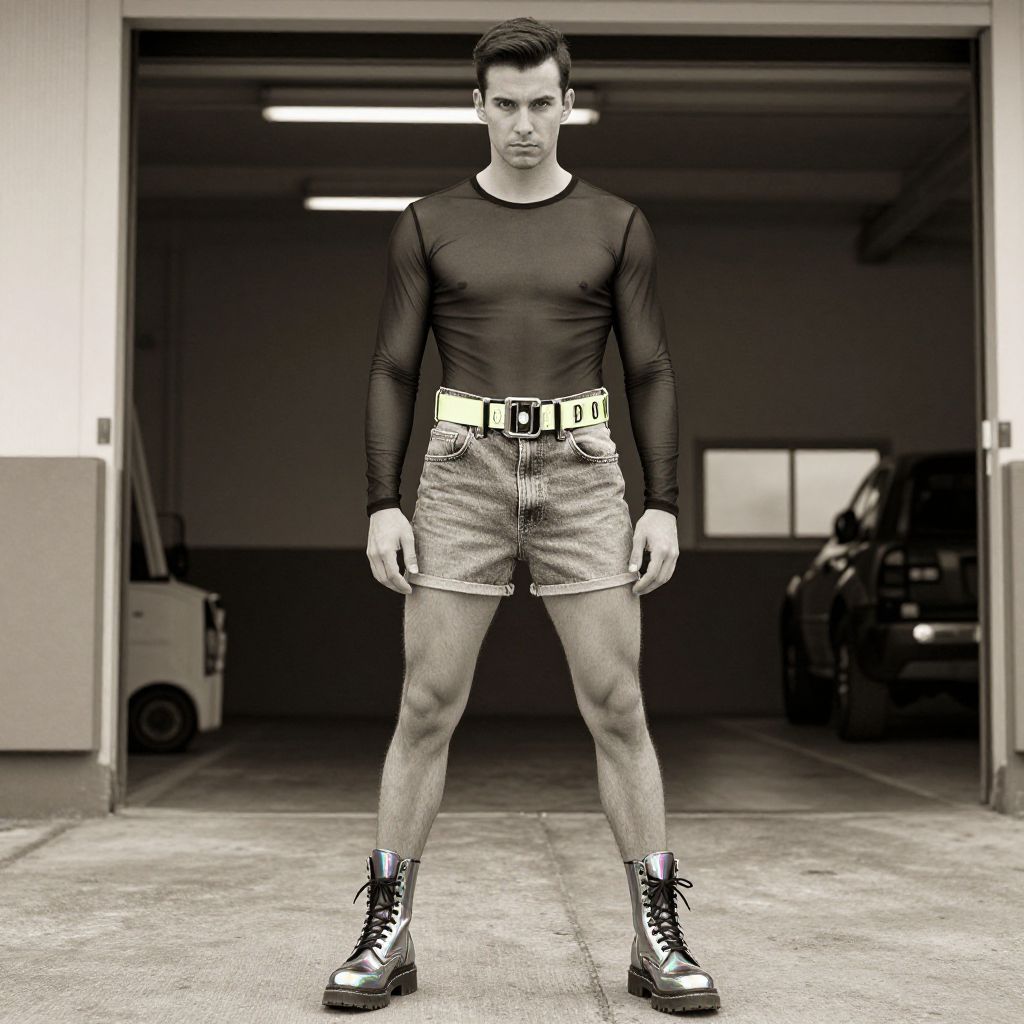 A man, sheer mesh long-sleeve top, high-waisted denim shorts, iridescent combat boots, oversized statement belt, neon accents, open loading docks, sepia effect, confident expression Man has masculine face and piercing eyes