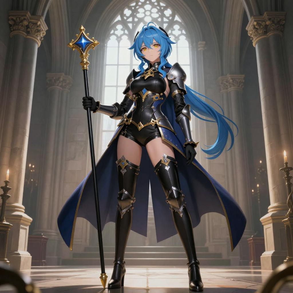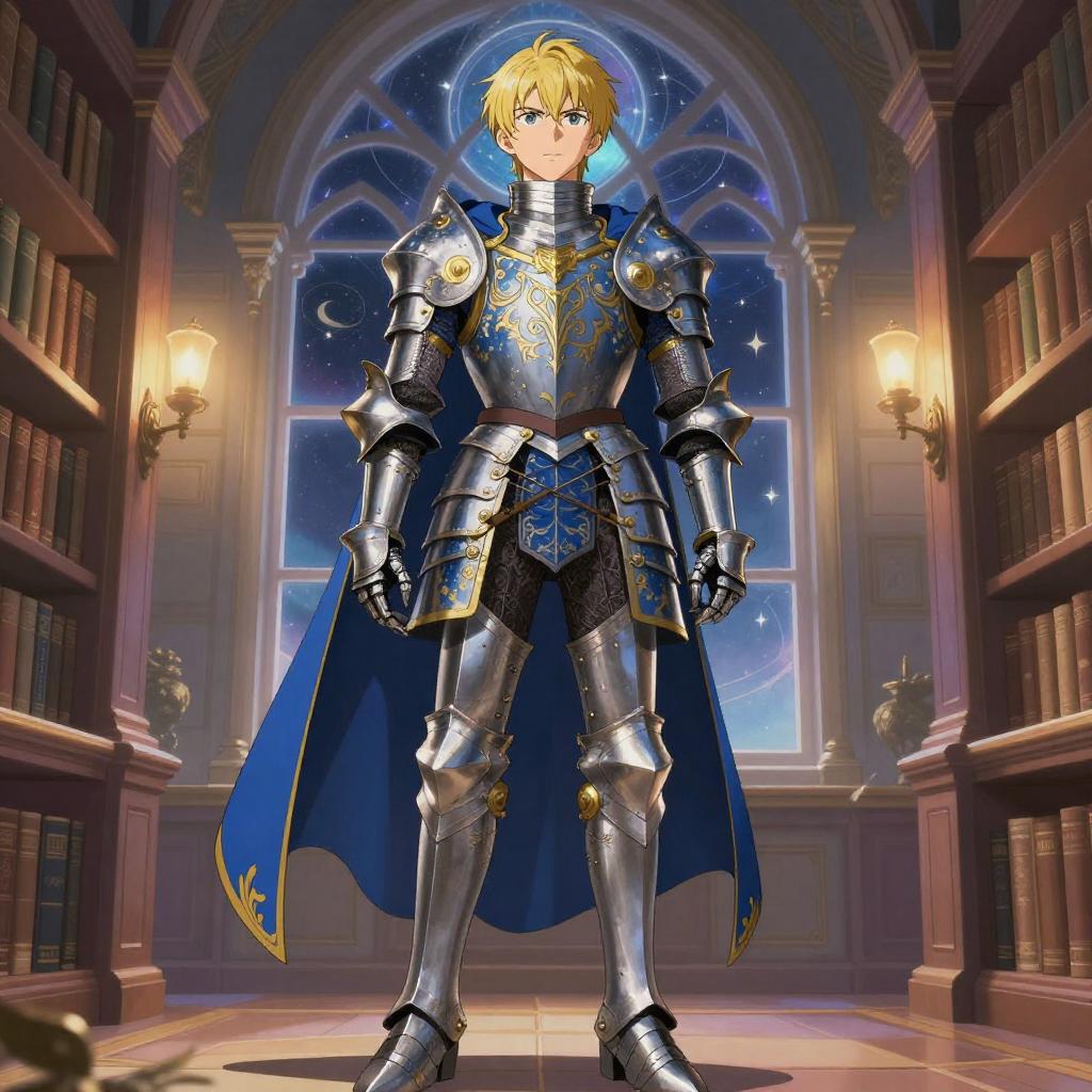 Anime-style depiction of a valiant knight wearing intricate blue and gold Art Nouveau armor, standing in an ethereal midnight library with celestial decorations on the arched window behind. The knight is dressed in full plate armor with detailed ornate patterns and a long flowing cape, illuminated by warm wall sconces between tall wooden bookshelves.
