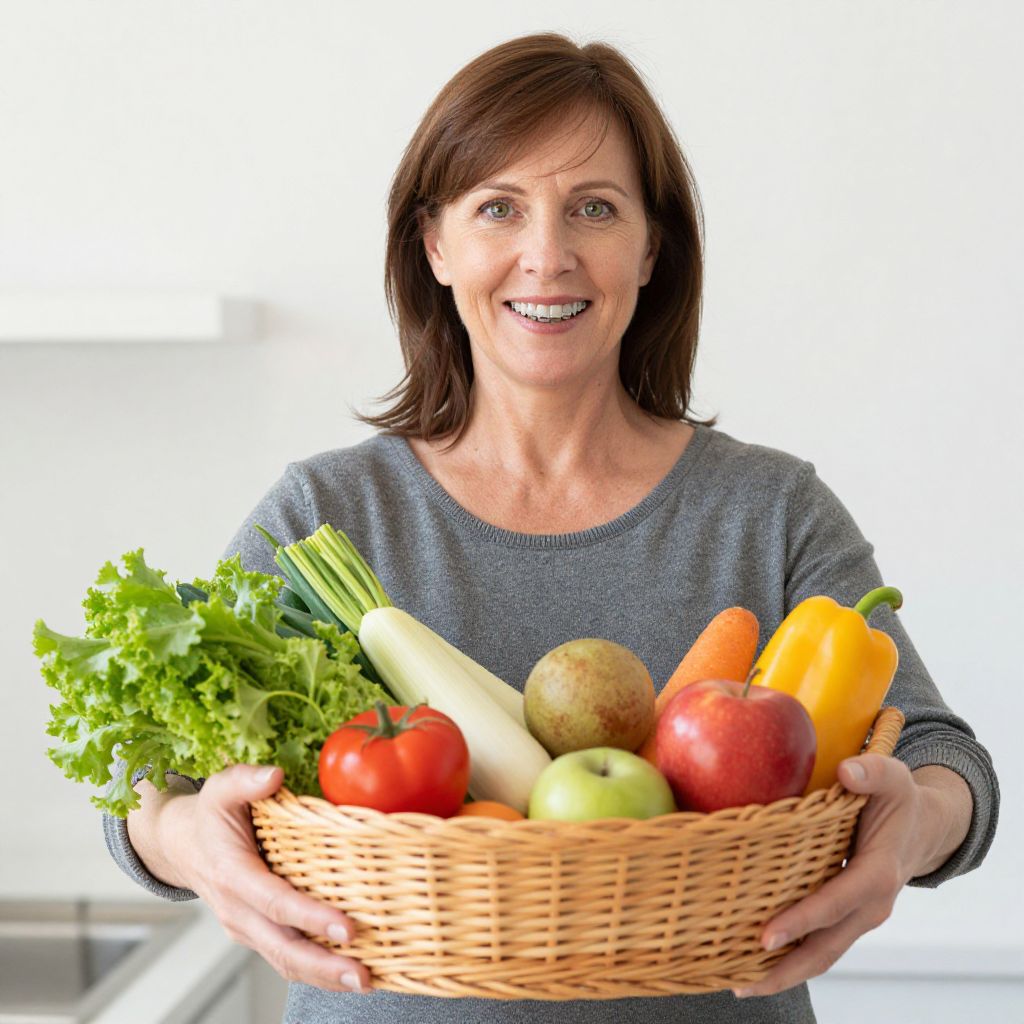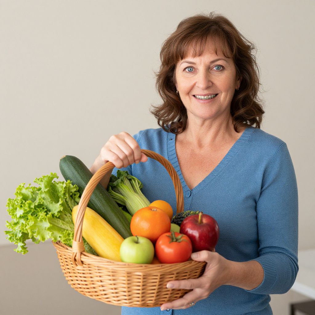 Photograph of a smiling middle-aged woman with brown hair, wearing a blue sweater, holding a basket filled with fresh vegetables and fruits against a white background
