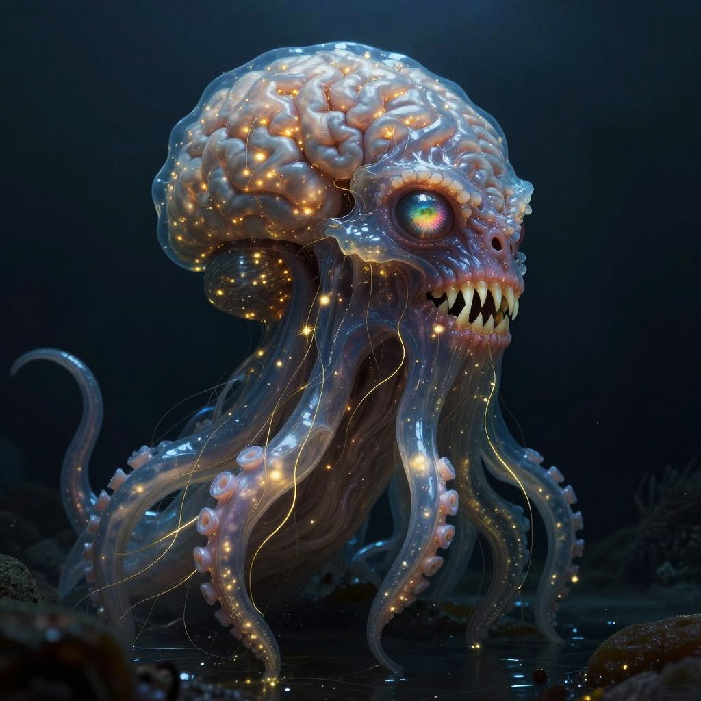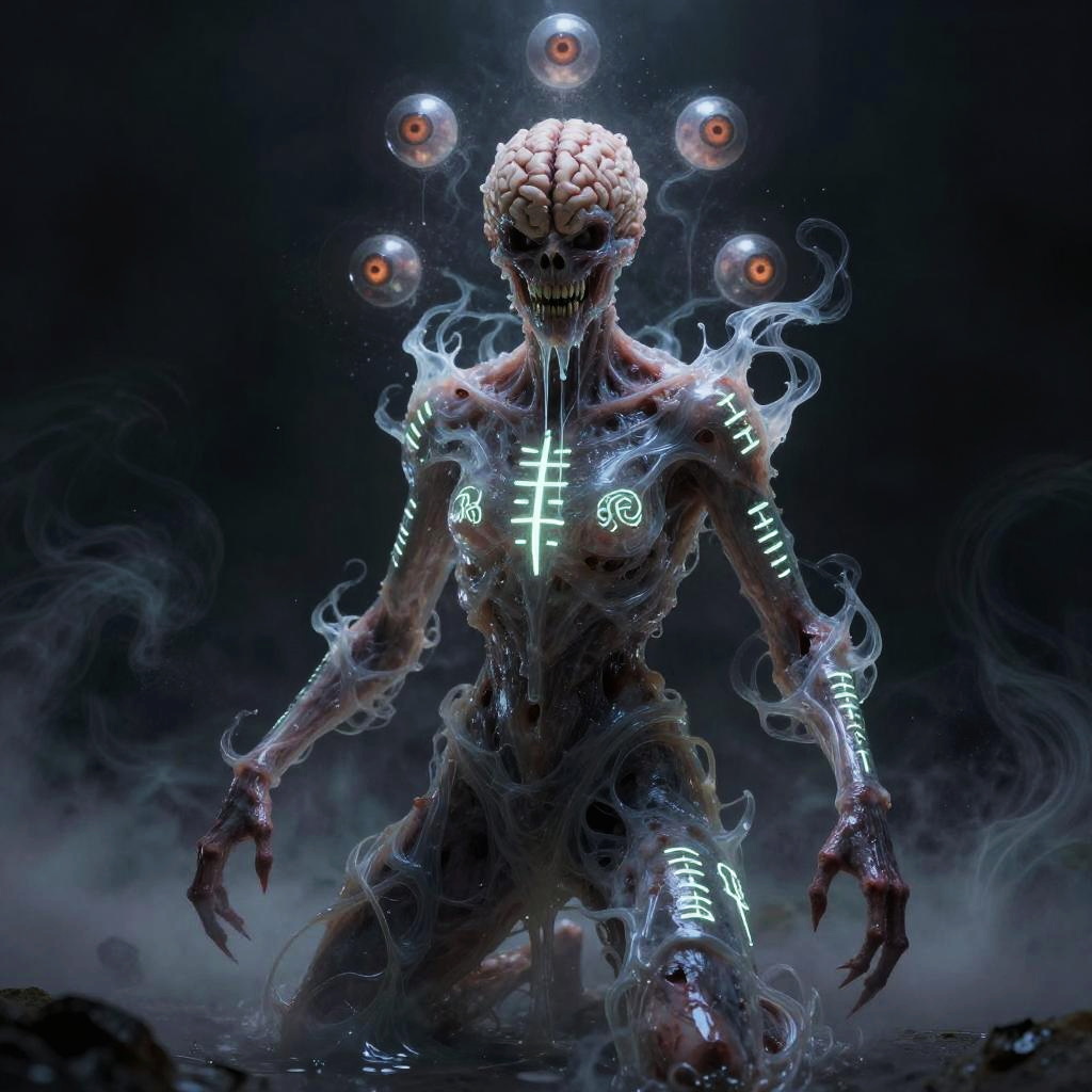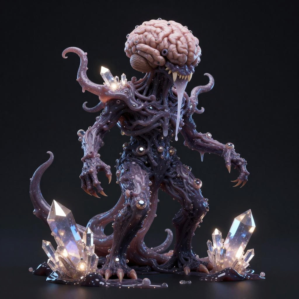 Digital artwork depicting a solo, terrifying eldritch entity with a metallic, liquid silver surface. The creature features an exposed brain with intricate details, sharp teeth, radiant shifting eyes, and a slimy, dripping texture. The dark background enhances the eerie and majestic atmosphere of this surreal horror character.