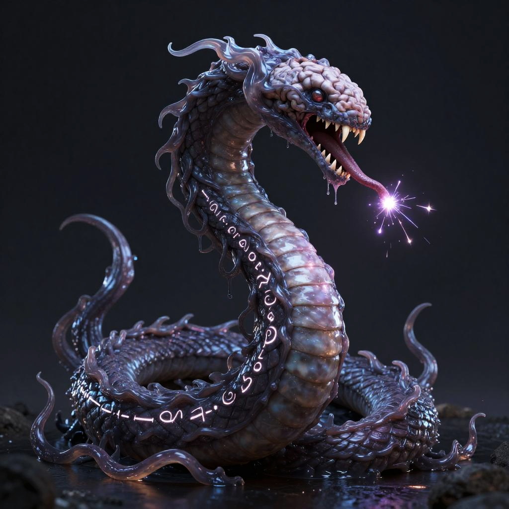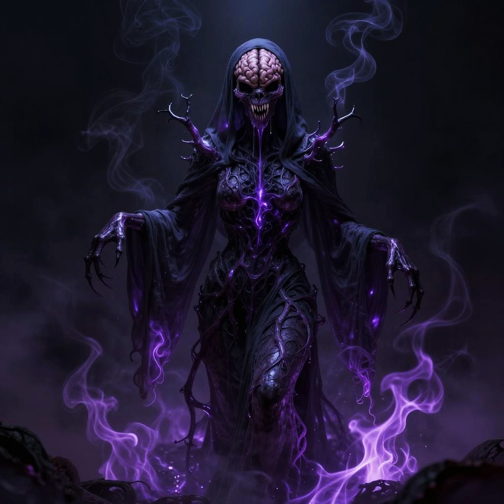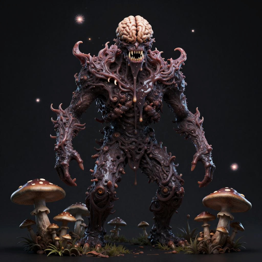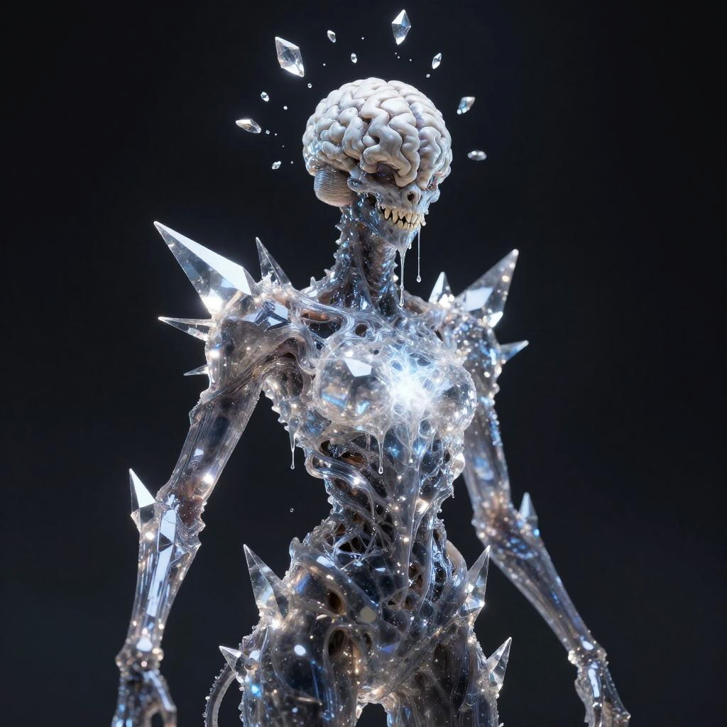 Digital artwork depicting a solo, terrifying eldritch entity with a metallic, liquid silver surface. The creature features an exposed brain with intricate details, sharp teeth, radiant shifting eyes, and a slimy, dripping texture. The dark background enhances the eerie and majestic atmosphere of this surreal horror character.