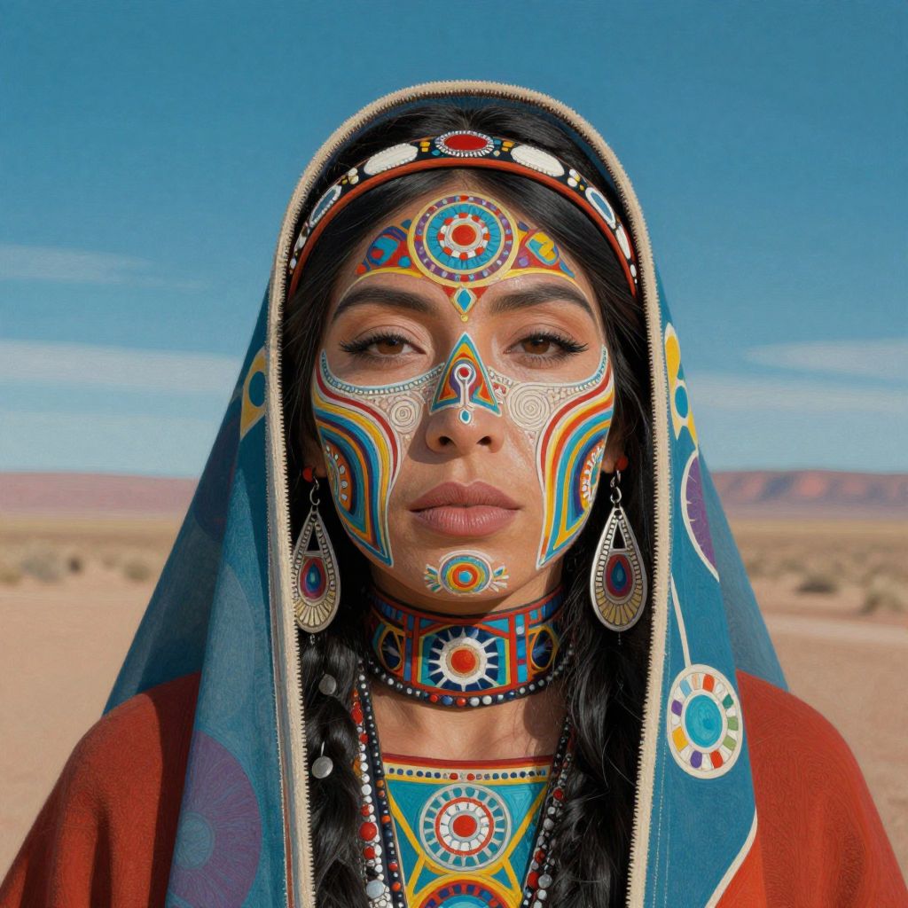 A Navajo woman's face adorned with intricate, colorful patterns against a desert backdrop, reminiscent of Alex Grey's art style.