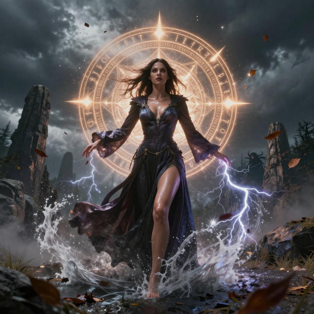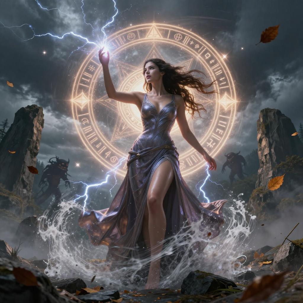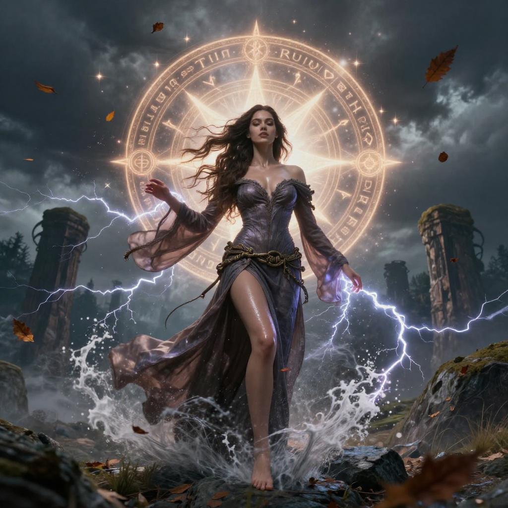 In the style of Style-Autumn, art by ROBERT MAGUIRE, Masterpiece, best quality, (realistic), beautiful (woman:1.1), shiny skin, soft lighting, (bodycon) wizard robe, windy mountain top, stormy ((backlighting)), ((bloom)), [light sparkles], ((chromatic aberration)), sharp focus, fantasy wizard, (perspective:1.1), (from below:1.1), (erotic wizard robe:1.1), (in the style of Dungeons & Dragons and Lord of the Rings:1.2), (powerful:1.2), casting a spell, swirling water around her, electricity, electricity sparks all around her, pillars of rock coming out of earth, stormy, strong wind, electricity sparks across the ground, leaves fly around her, glowing magical circle, powerful runes, shadow monsters in background, dark forest in background