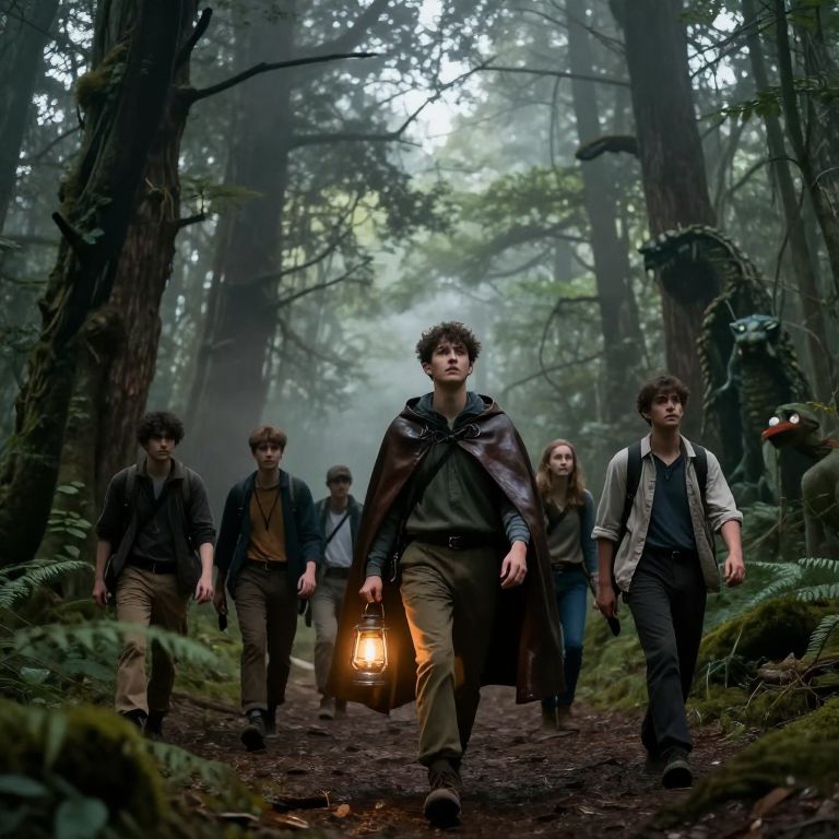 Young prefect leading a group of explorers through a misty forest, wearing a leather cloak and holding a lantern, towering trees and mysterious creatures, atmospheric and adventurous mood, ultra-realistic style.