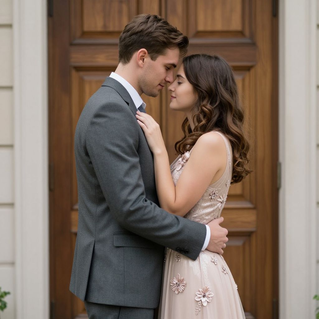 Romantic couple embracing tenderly in front of a classic wooden door, the man in a sharp gray suit and the woman in a shimmering blush dress adorned with delicate floral embellishments.