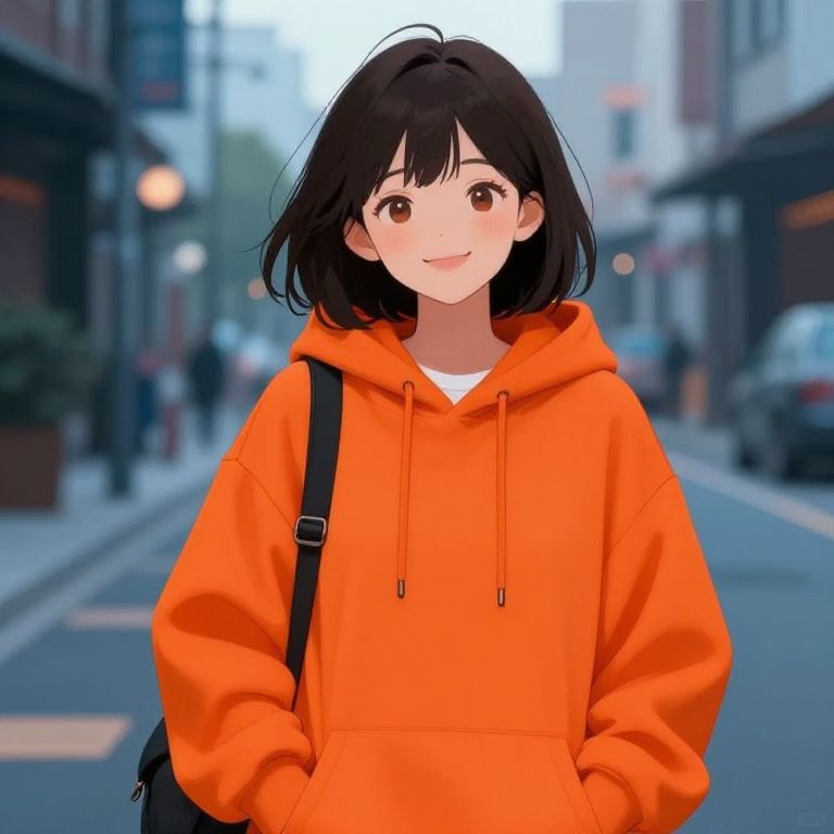 Anime girl orange hoodie, cozy urban street scene, casual style, playful smile, vibrant contrast with cool background tones, high resolution, detailed shading