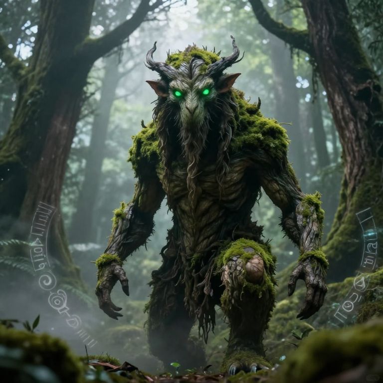 Frotal, a mythical forest guardian with moss-covered bark skin and glowing emerald eyes, surrounded by ancient trees and mystical fog, soft ethereal lighting, fantasy style detailed environment with magical runes floating around.