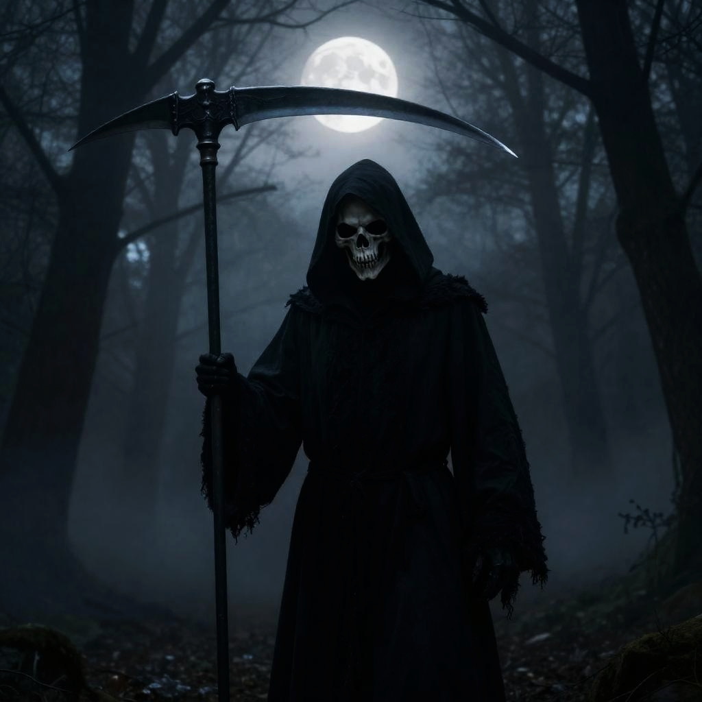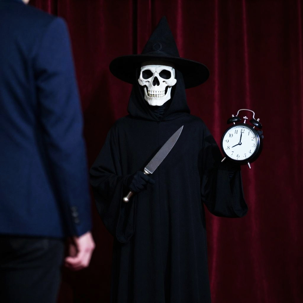 A puppet dressed as the Grim Reaper stands in front of red curtains, holding knives and a clock. A person in blue stands partially out of frame to the left. The puppet has a white skull face and wears a black outfit with a wide-brimmed hat. The scene is dimly lit with shadows.