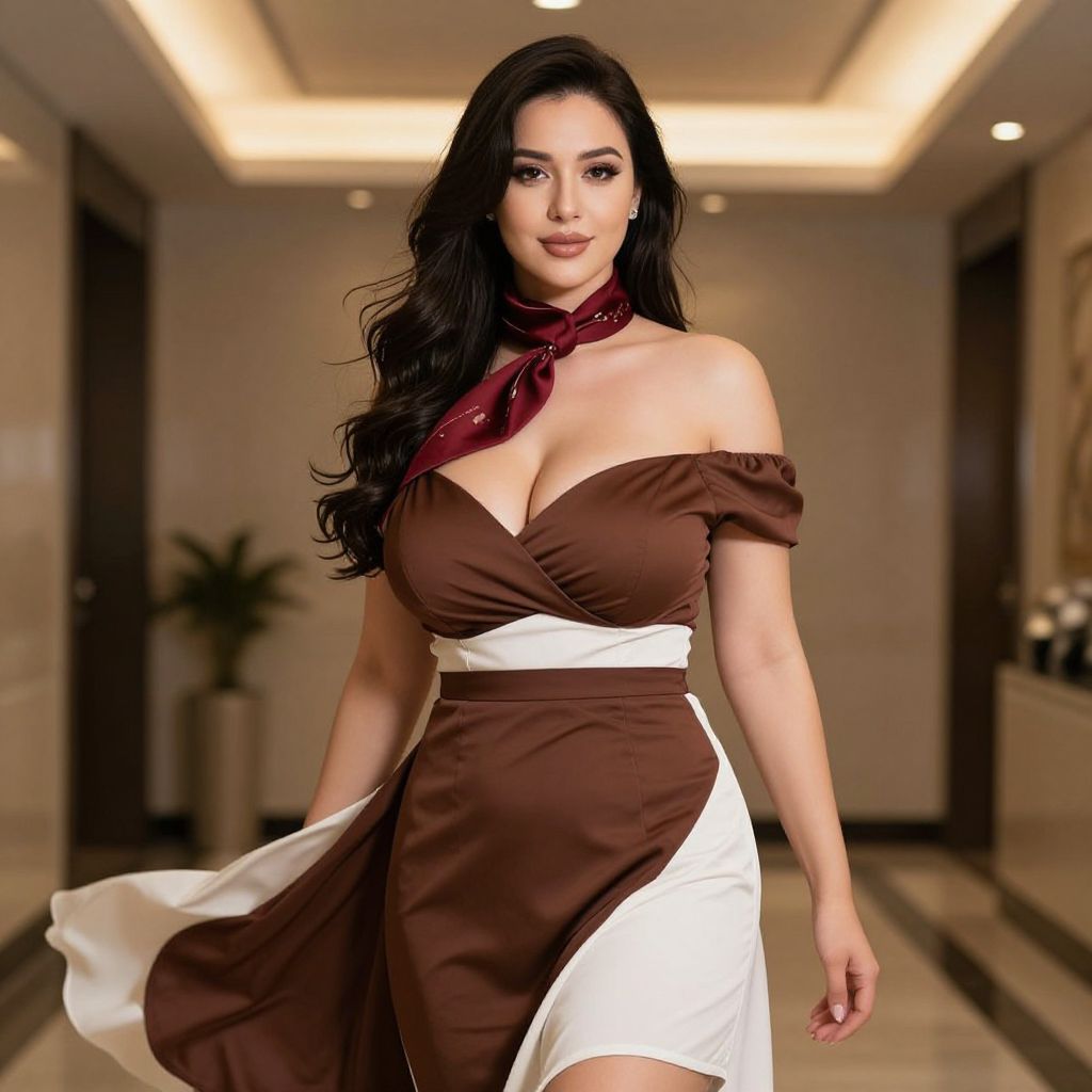 A beautiful woman with big tits and a sexy demeanor is wearing a stylish brown and white off-shoulder dress, the fabric flowing elegantly around her, wrapped in a rich red scarf around her neck, her long hair cascading softly over one shoulder. She exudes elegance and charm, standing confidently in a luxurious, modern setting with soft ambient lighting, golden hour glow, and a touch of sophistication—her expression warm and inviting, enhancing her sensual yet refined presence.