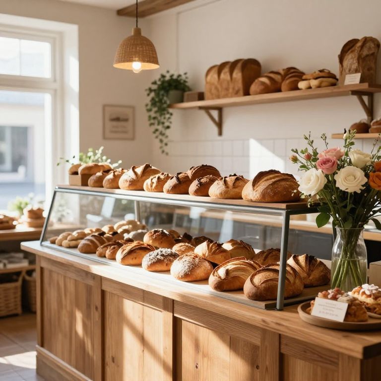 Bright, sunlit bakery with wooden shelves, glass display case, and fresh bread; a vase of white and pink flowers on the counter.