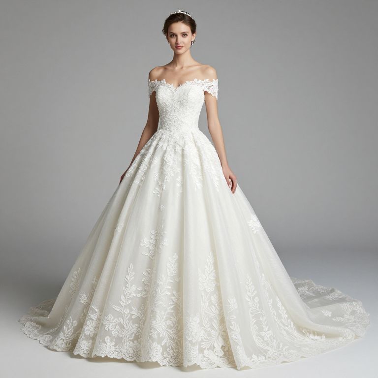 Photograph of a slender, fair-skinned woman with dark hair styled in an elegant updo, wearing an off-the-shoulder, white lace wedding gown with a full, flowing skirt adorned with intricate floral patterns. The gown features a fitted bodice and a long, trailing train. She stands against a plain, gray background, looking directly at the camera with a serene expression. The lace texture is delicate and detailed, adding a touch of elegance to the classic bridal look. The lighting is soft, highlighting the gown's details and the woman's natural beauty.