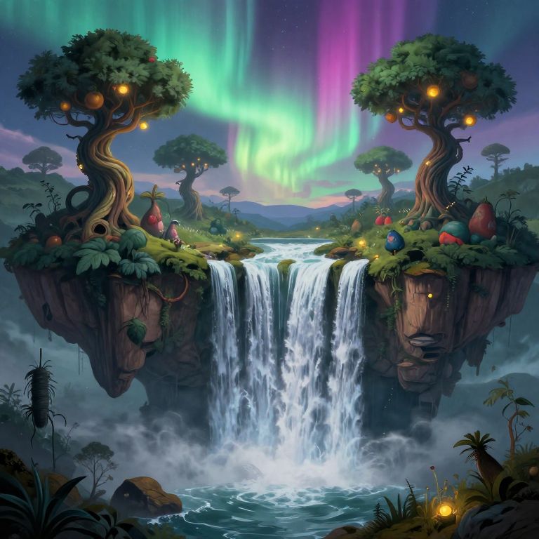 Digital fantasy artwork depicting a vibrant, magical landscape. Two twisted, glowing trees with spherical lights and colorful, round fruits float above a cascading waterfall, which flows into a misty pool below. The background features a mesmerizing aurora borealis in shades of green, purple, and pink, illuminating the twilight sky. The foreground includes silhouetted plants and rocks, enhancing the enchanted, otherworldly atmosphere. The scene is rich in detail, with lush textures and vivid colors, creating a surreal and captivating visual experience.
