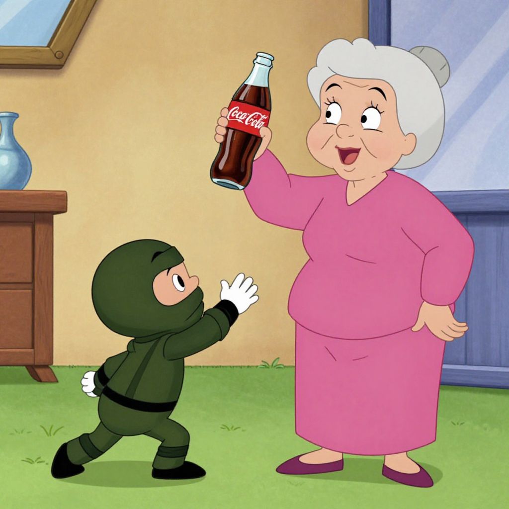 Intricately Designed A tiny man in a ninja costume sneaking up on a grandmother using only a coca cola bottle, cartoon style image, hanna-barbera animation, vibrant colors, illustration 4k,