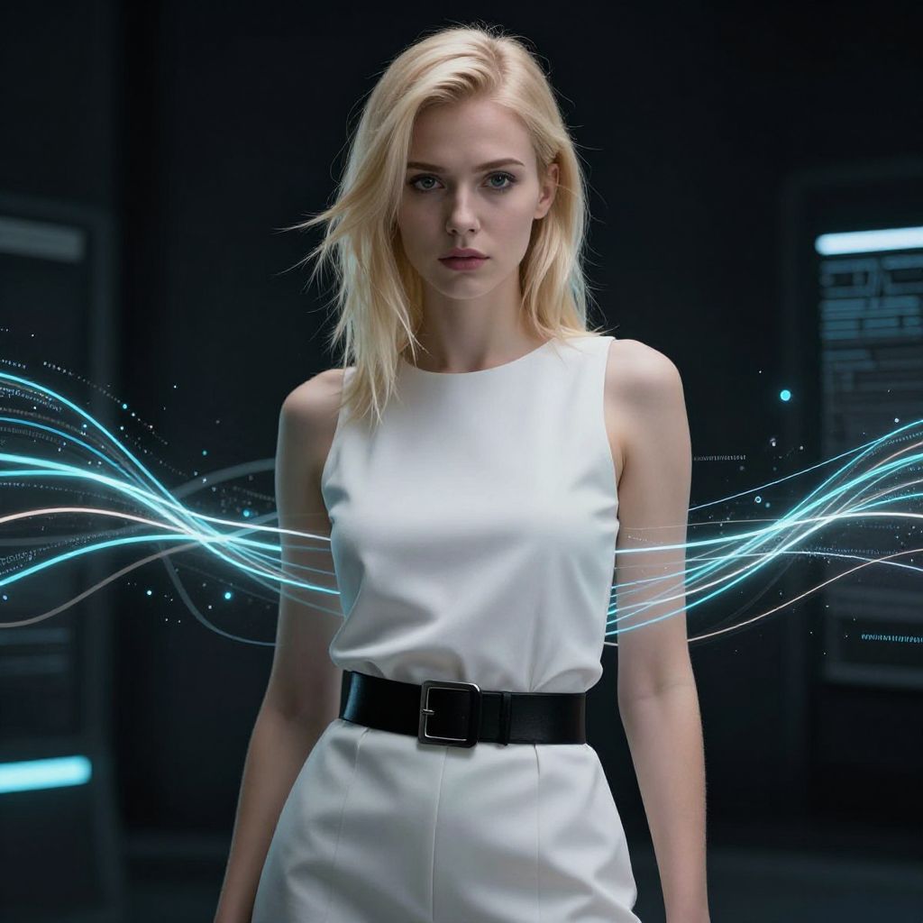 Photograph of a blonde woman with light skin and a slim build, wearing a sleeveless white dress with a black belt. Her straight hair falls to her shoulders, and she has a serious expression. The background is dark with neon blue light waves swirling around her, adding a futuristic effect. She stands in front of blurred, indistinct industrial elements. The image has a high-contrast, sci-fi aesthetic with a focus on her white dress and the glowing blue waves.