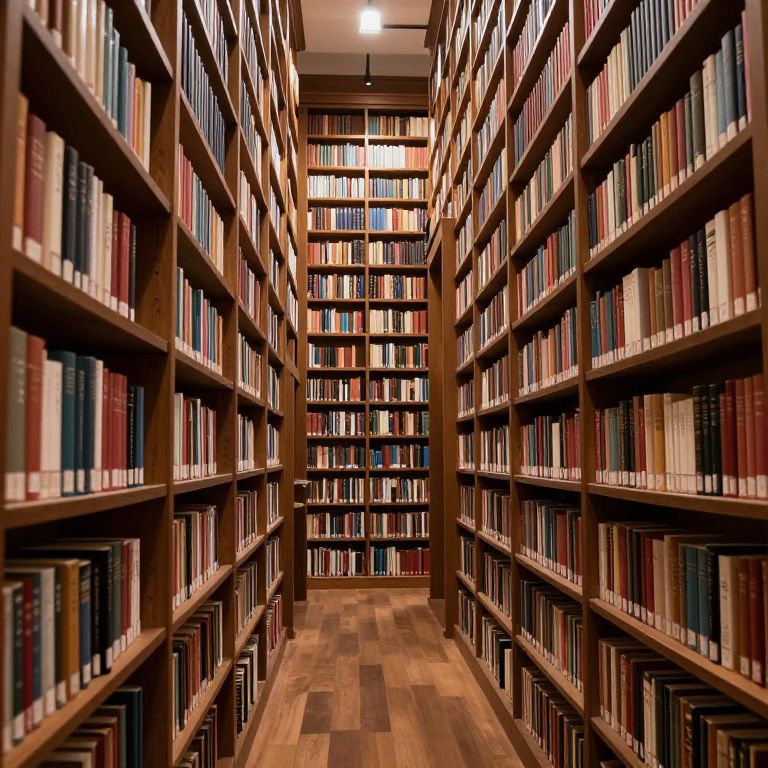 Photograph of a narrow, warmly lit library aisle with tall, dark wooden bookshelves on both sides, filled with an array of books of various colors and sizes. The shelves stretch into the distance, creating a tunnel effect. The floor is made of wooden planks in shades of brown. The ceiling has a single white light fixture, illuminating the books. The image captures the organized and inviting atmosphere of the library, emphasizing the abundance of literature.