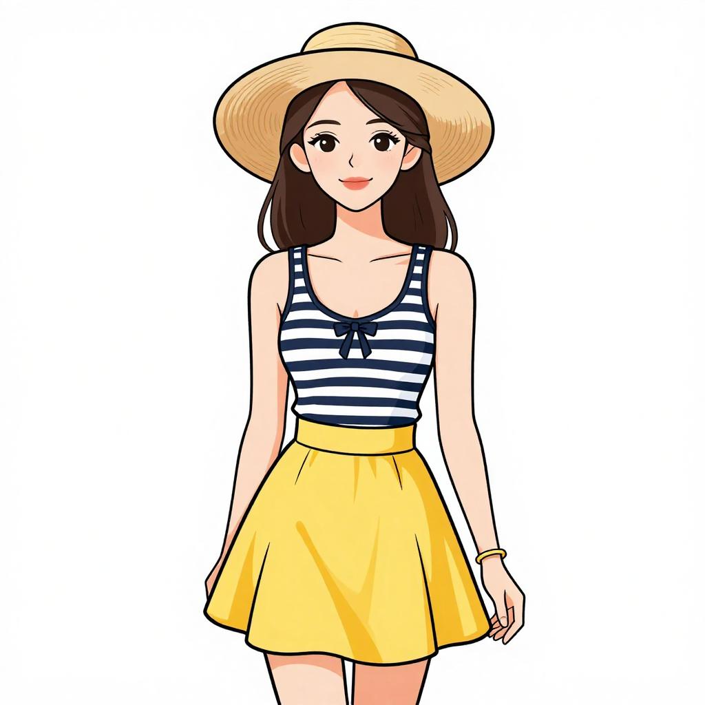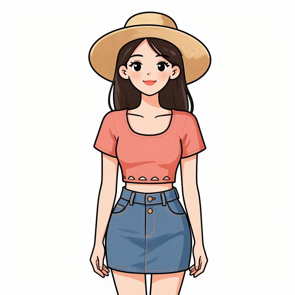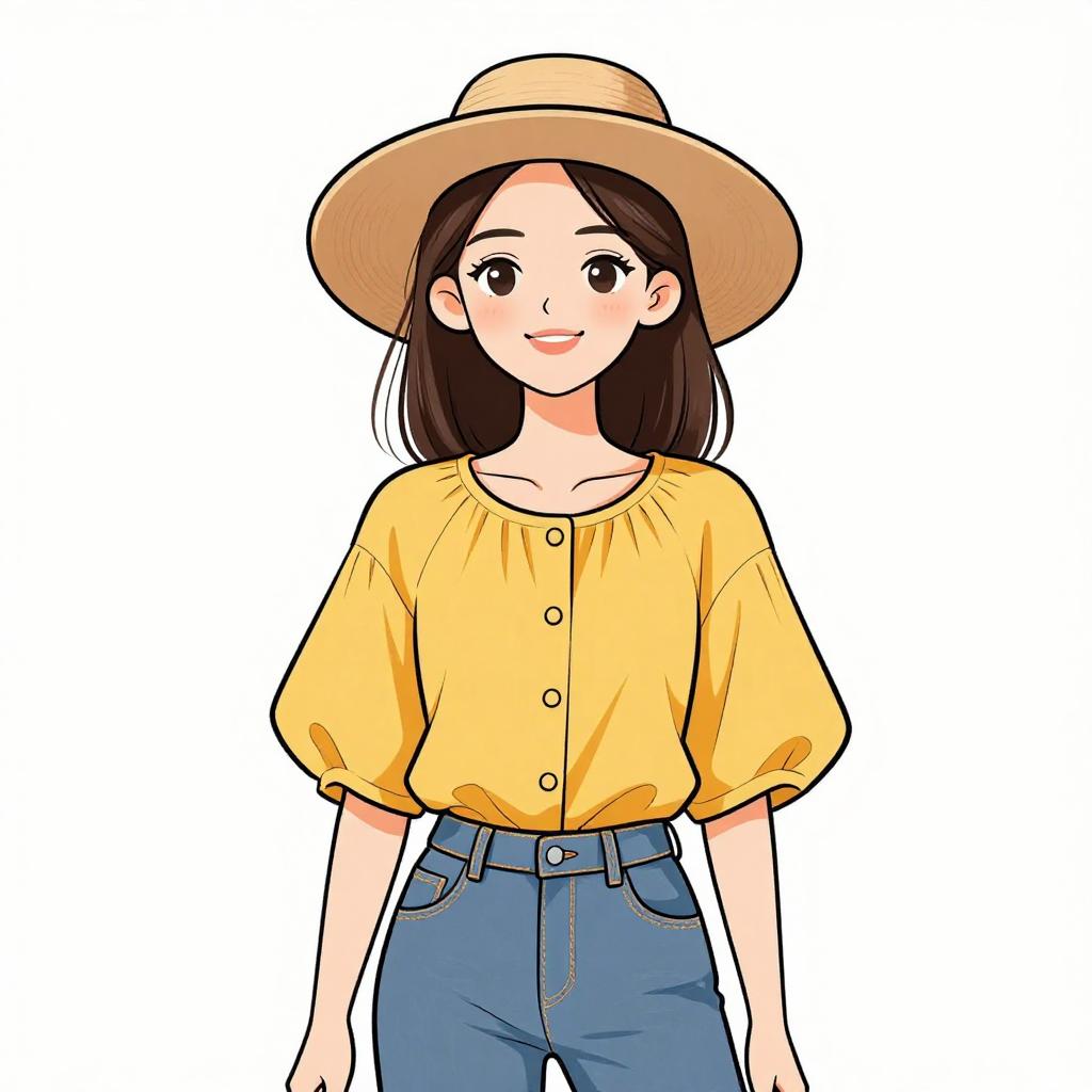 Woman with pretty face and pretty hair. smiling Woman, casual, mustard yellow blouse with round neckline and button details on the front, short floating sleeves, tucked into blue denim jeans, wide-brimmed tan floppy hat. --sref 1467