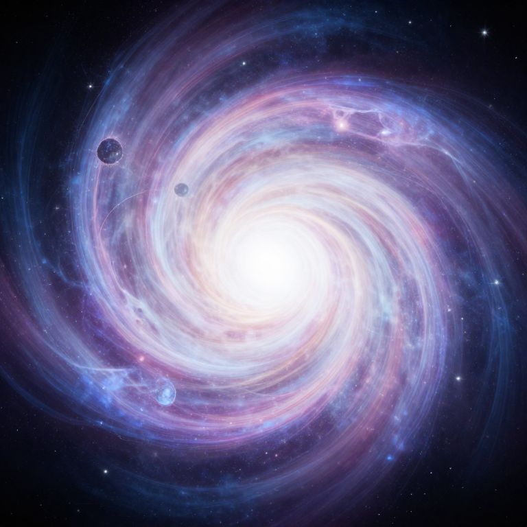 Digital artwork of a bright, swirling galaxy with a white core, surrounded by blue and purple nebulous clouds, and small dark planets. Starry background