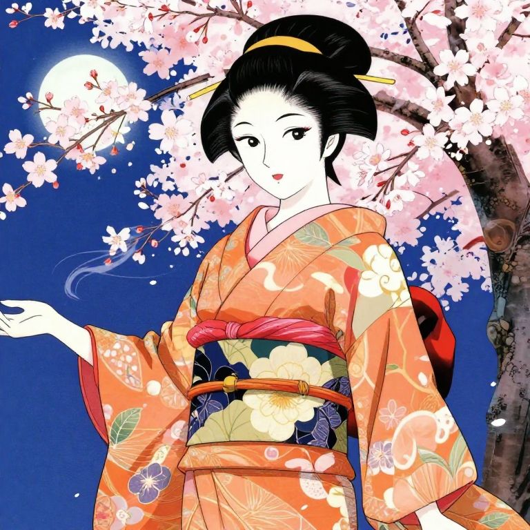 Anime interpretation of ukiyo aesthetic showing a graceful geisha in a flowing kimono under cherry blossoms, stylized with sharp anime eyes and traditional woodblock print detailing, vivid colors highlighting kimono patterns, gentle breeze effect and a moonlit background
