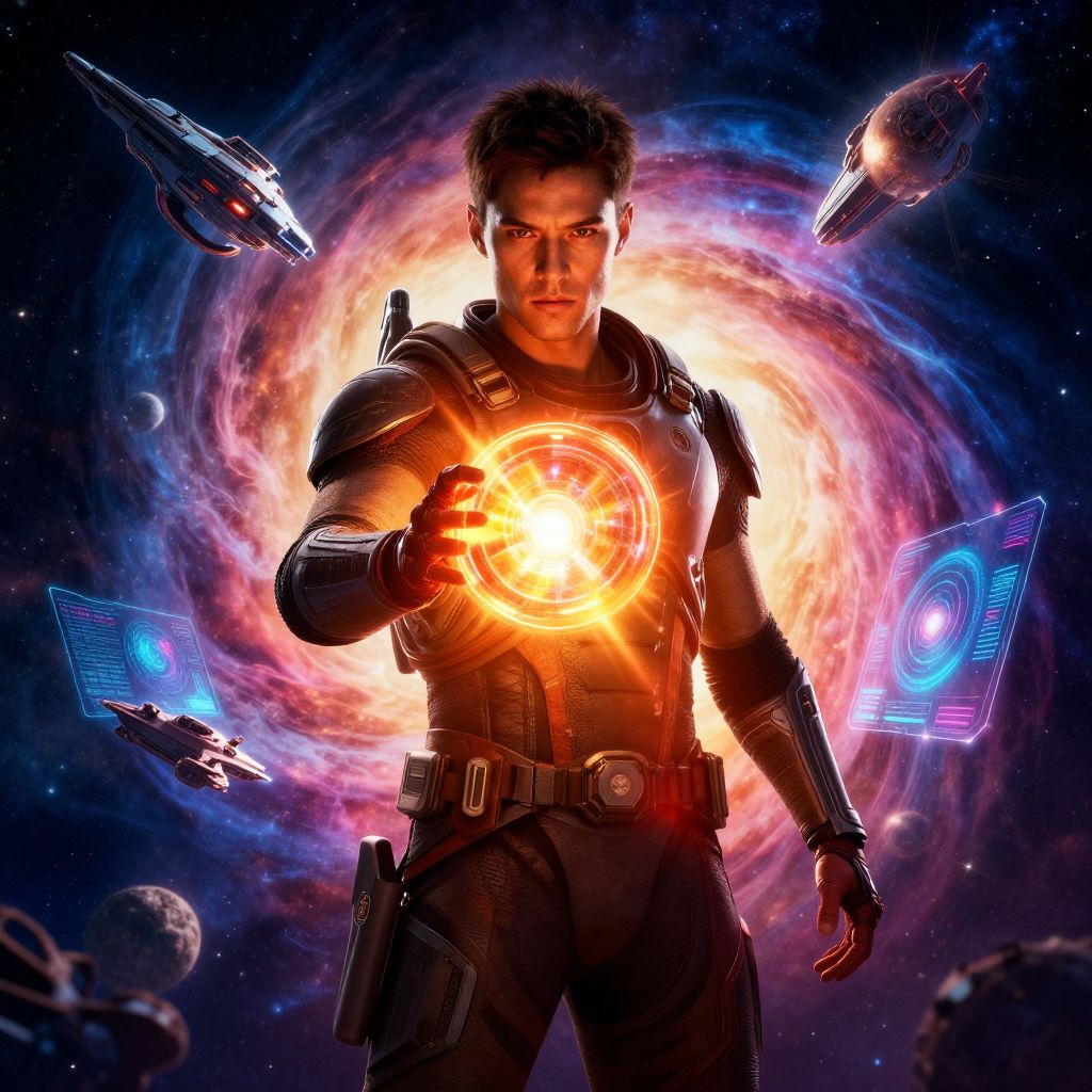 AI generated movie poster presenting an epic sci-fi adventure, with a bold central figure holding a glowing artifact, surrounded by swirling galaxies, starships, and holographic interfaces, intense colors with a blend of realism and surrealism.