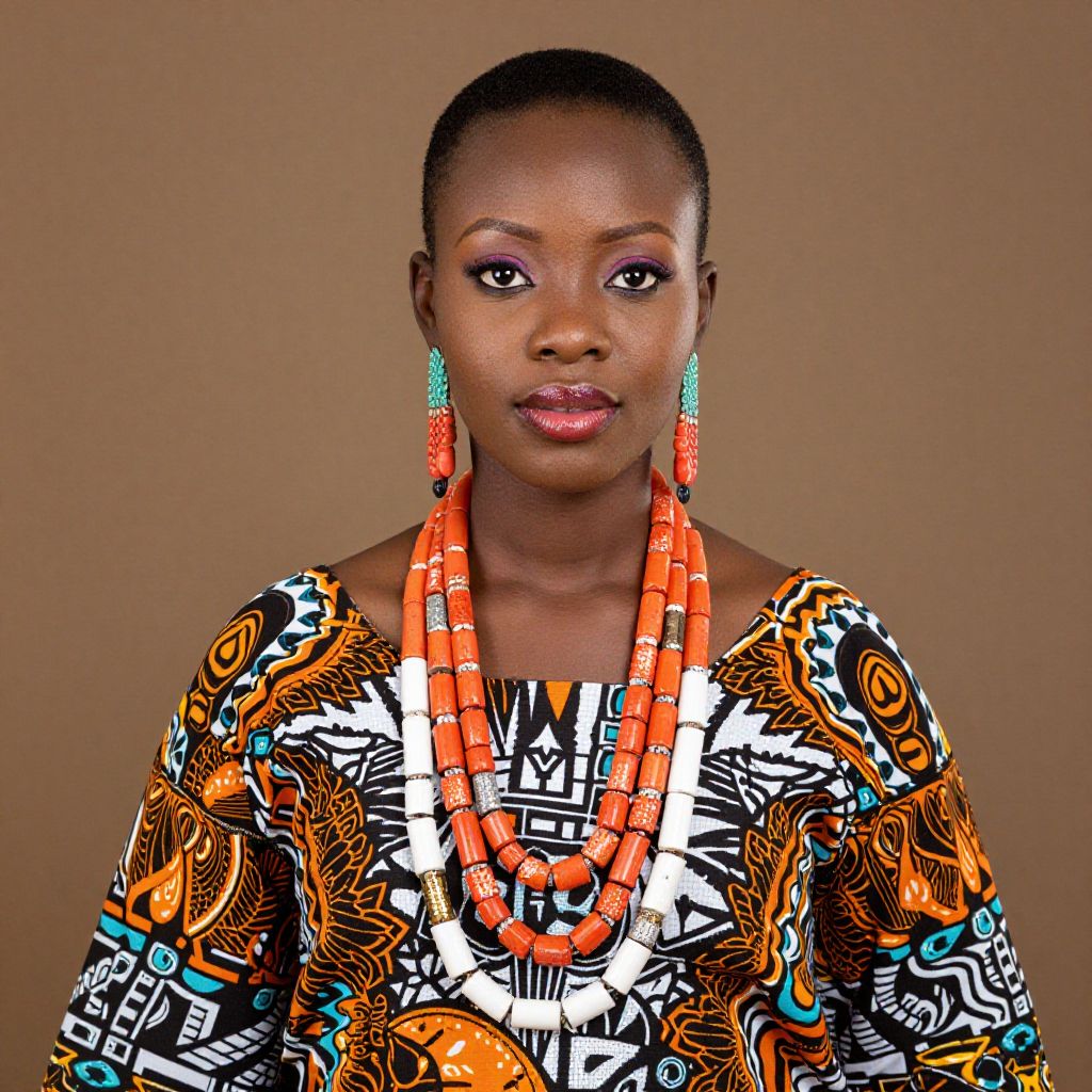 "Trending Owambe Style, woman in traditional african dress with a beaded necklace and earrings"