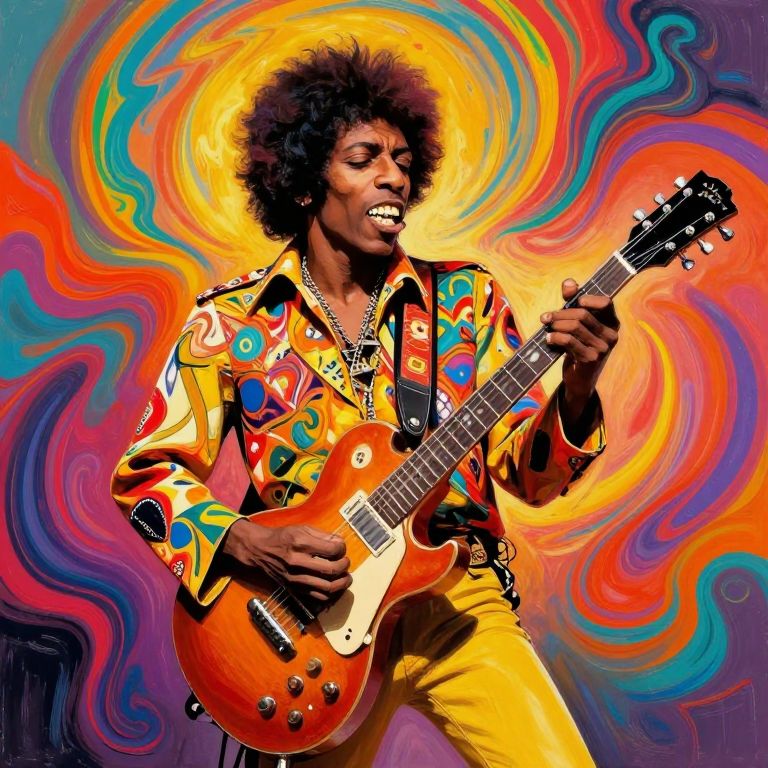 Abstract Expressionism Jimi Hendrix - Psychedelic whirlwind, Jimi passionately playing his guitar with his teeth, surrounded by vibrant, swirling colors at the Monterey Pop Festival.,