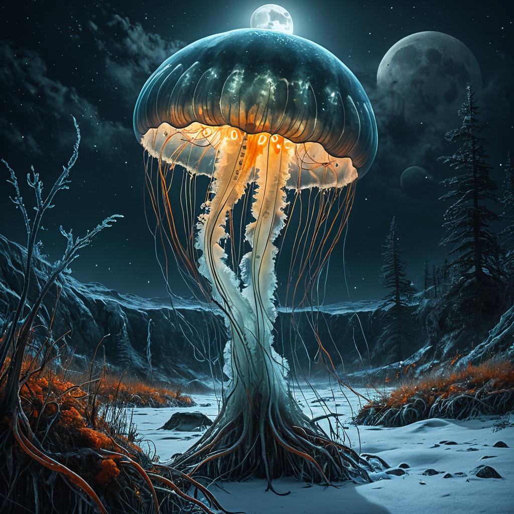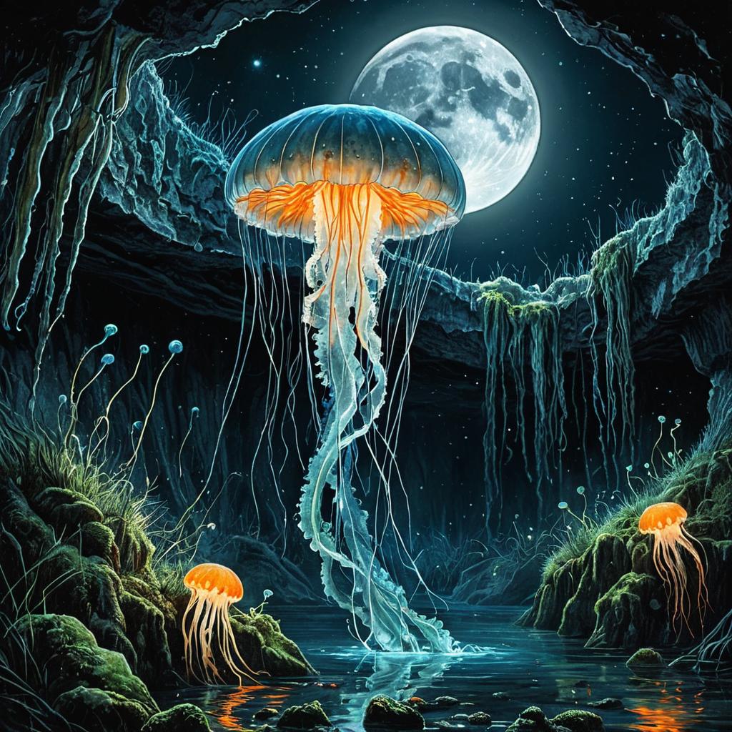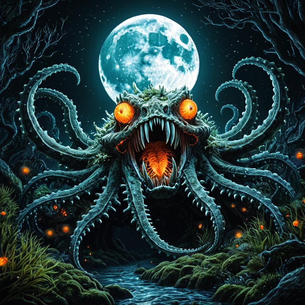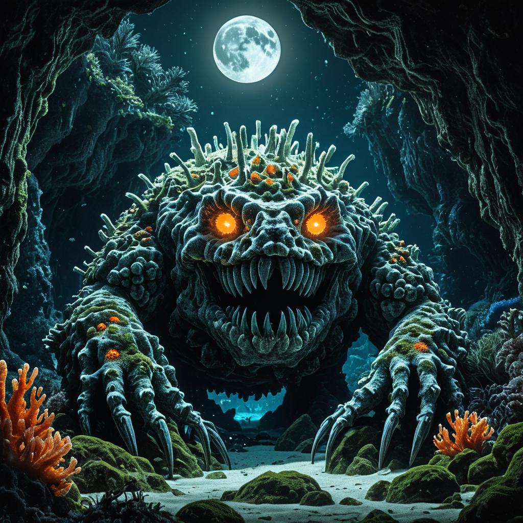 No humans, gigantic bioluminescent jellyfish emerging from dark coral reef under a full moon, bioluminescent spores drifting around its gaping maw lined with razor-sharp teeth and glowing orange eyes, mossy roots and grass bathed in soft silver light, rendered in digital watercolor with luminous layering