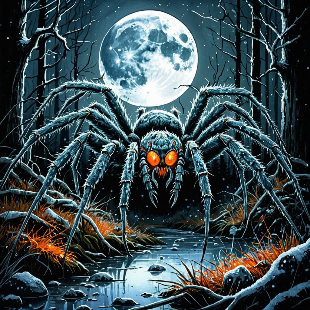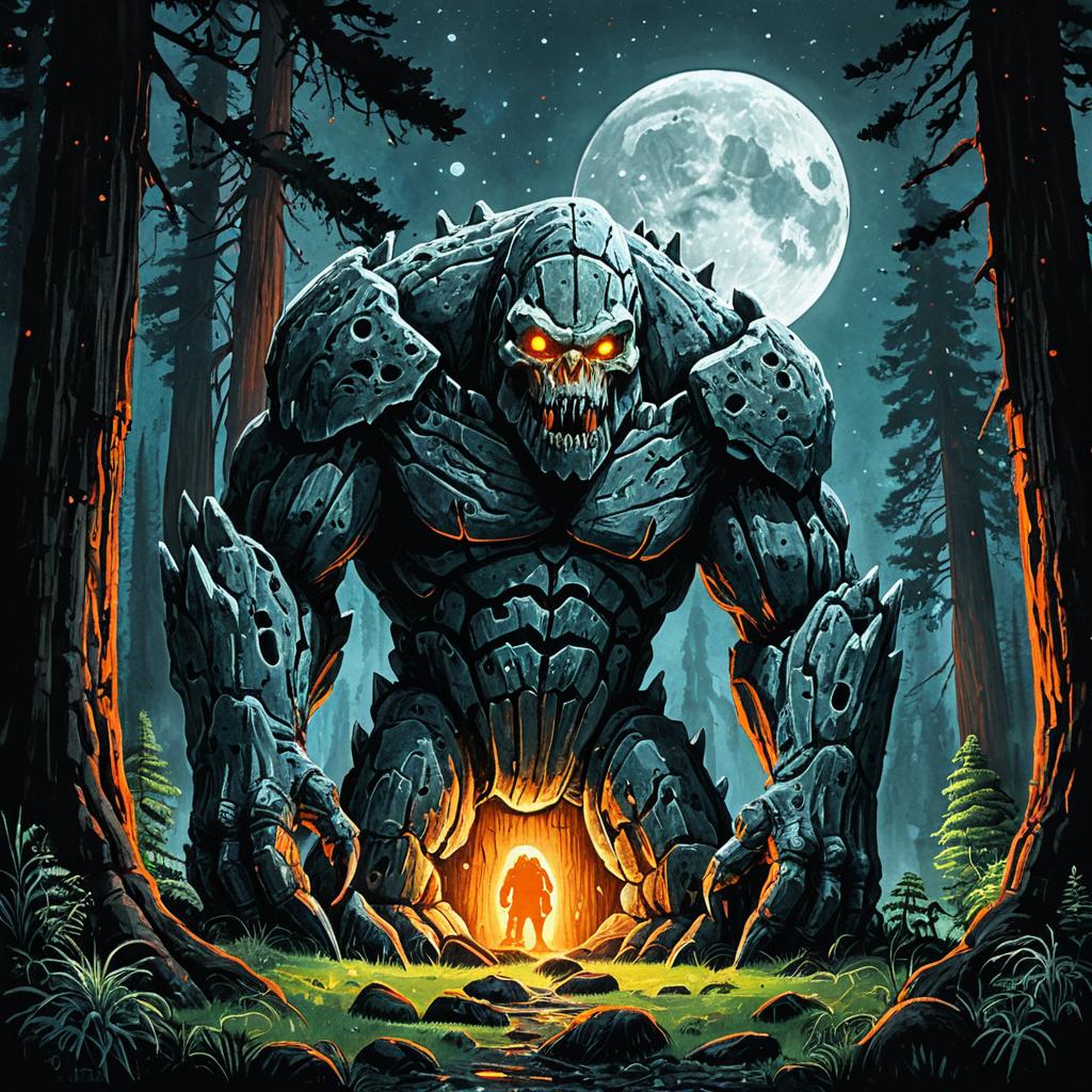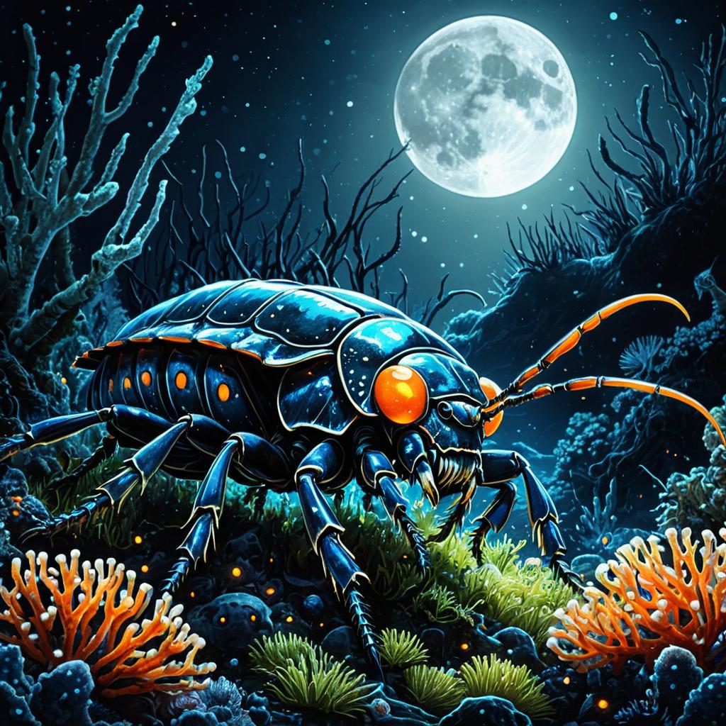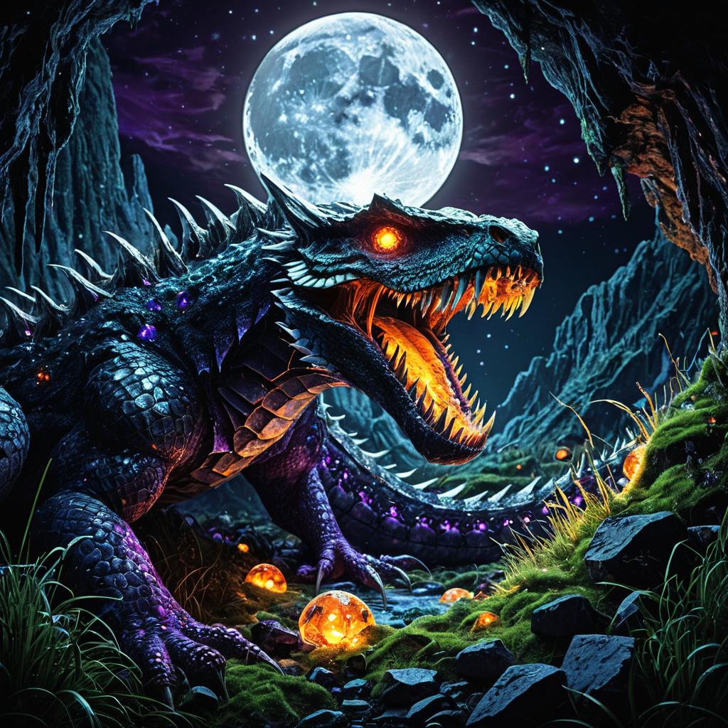 No humans, gigantic bioluminescent jellyfish emerging from dark coral reef under a full moon, bioluminescent spores drifting around its gaping maw lined with razor-sharp teeth and glowing orange eyes, mossy roots and grass bathed in soft silver light, rendered in digital watercolor with luminous layering
