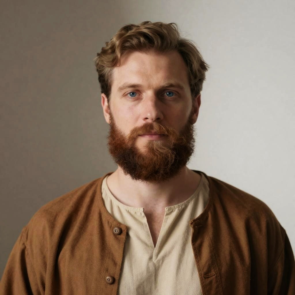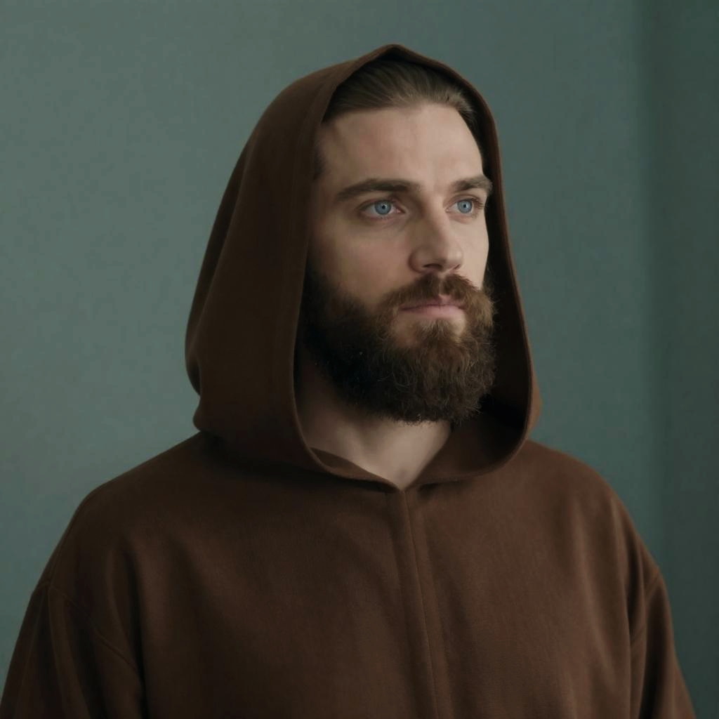 Photograph of a bearded man with light skin and blue eyes, wearing a brown hooded robe with the hood up. He looks to the side with a thoughtful expression. Background is a blurred teal color. Upper body shot.