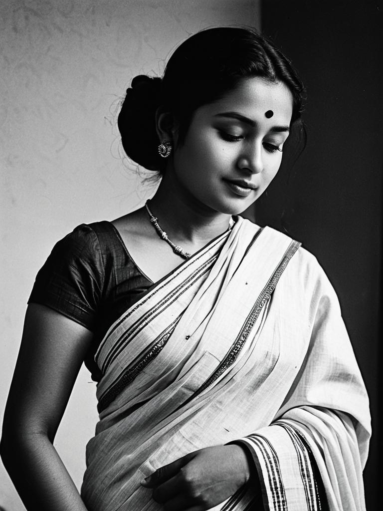 Woman in Malmal Cotton Saree, waist-up editorial portrait, photorealistic tones