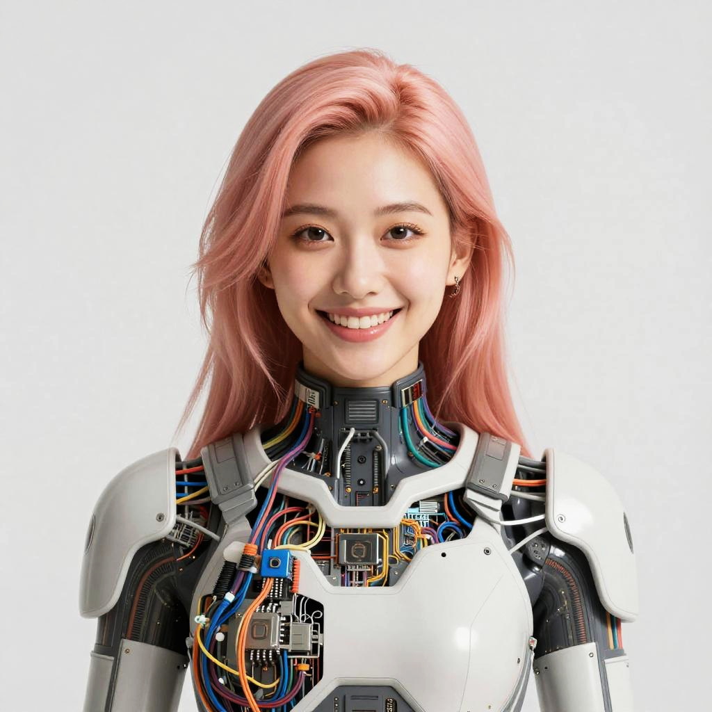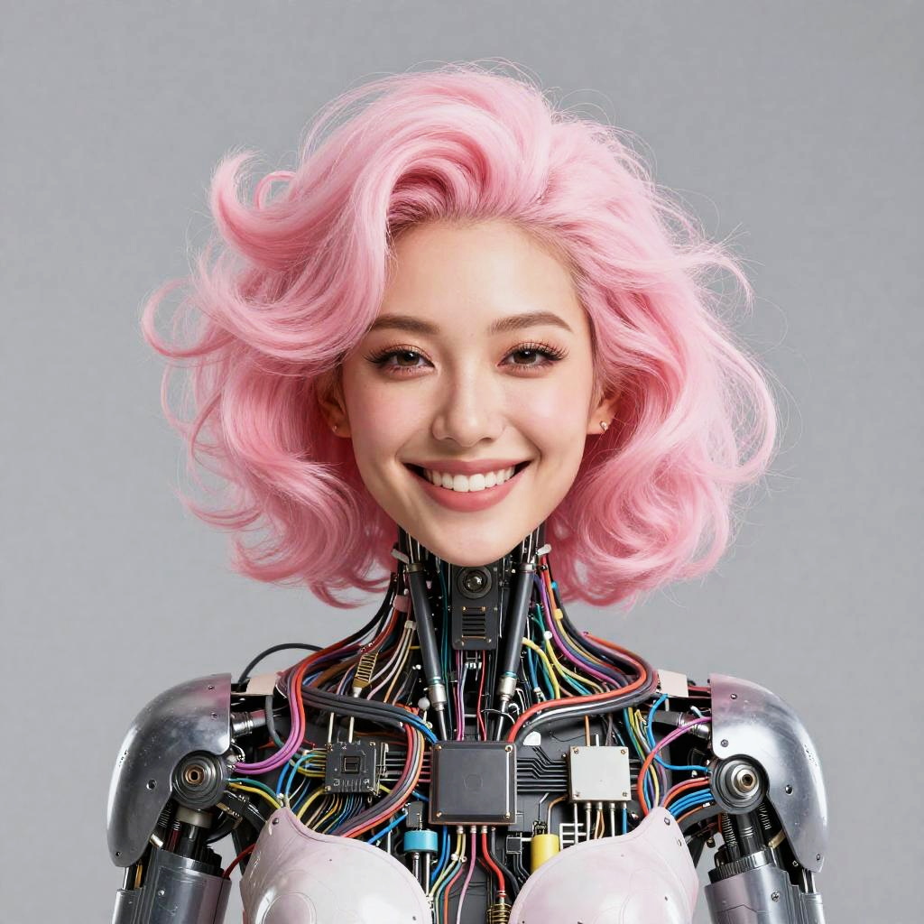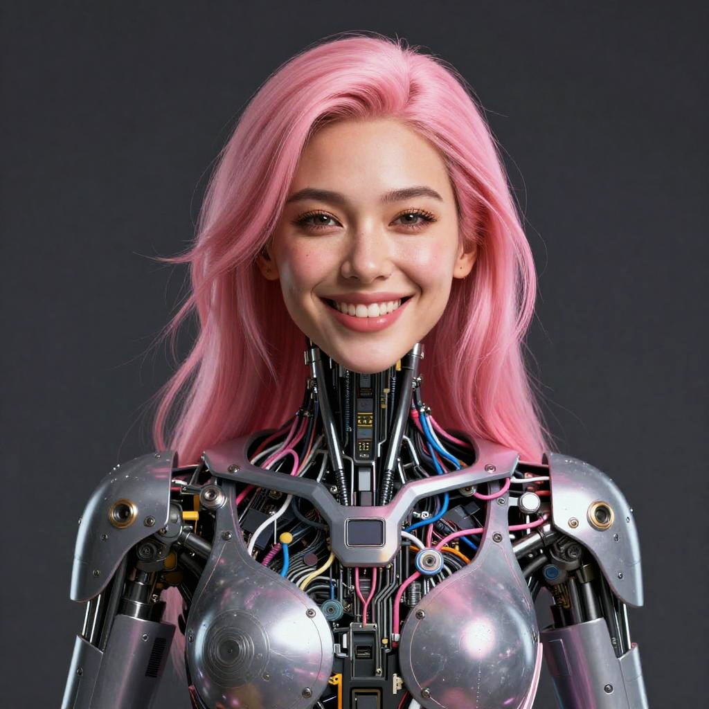 Portrait of a smiling, beautiful female bio-mech assassin with neon pink hair, missing panels exposing electronics and circuitry, intricate and abstract wire management, sci-fi concept art, octane render, hyperrealism, portrait photograph style, Nikon quality