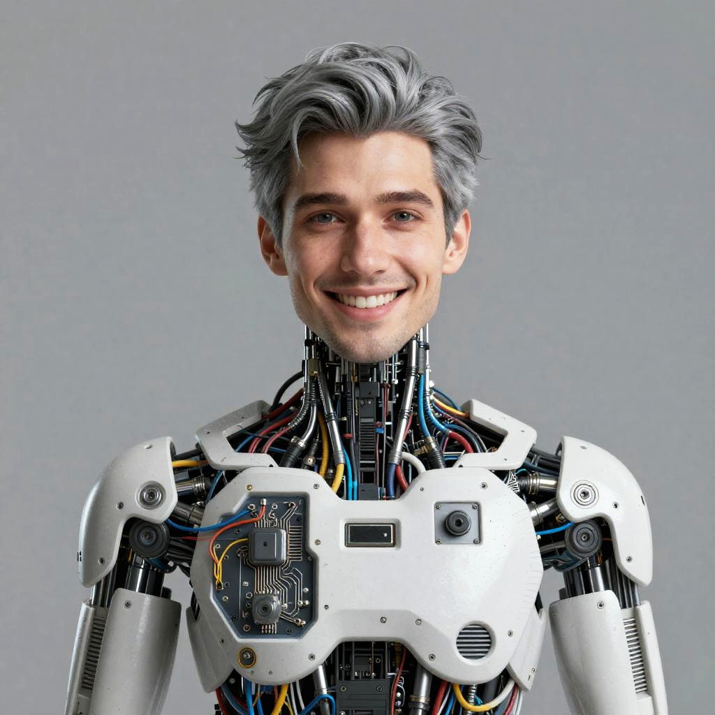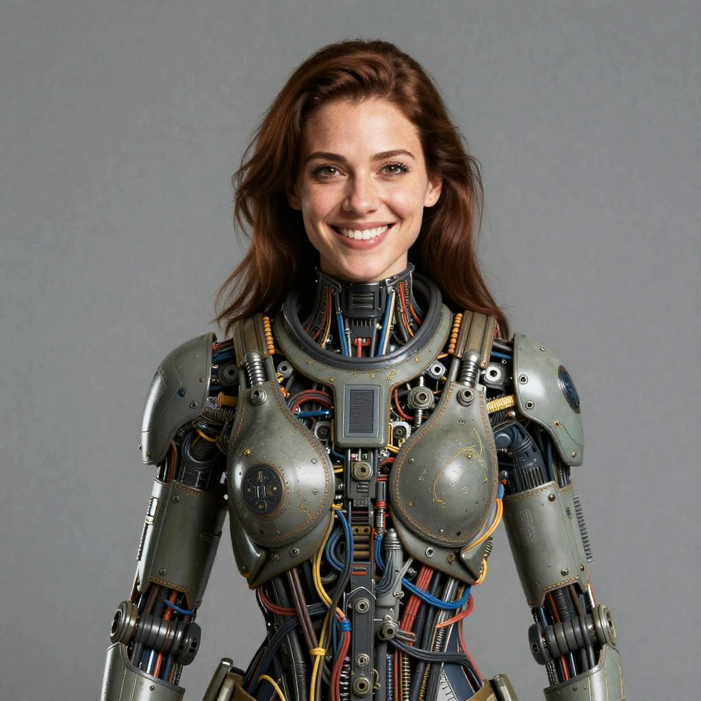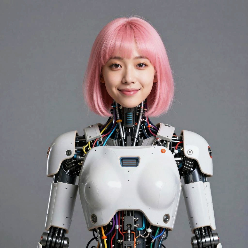 Portrait of a smiling, beautiful female bio-mech assassin with neon pink hair, missing panels exposing electronics and circuitry, intricate and abstract wire management, sci-fi concept art, octane render, hyperrealism, portrait photograph style, Nikon quality