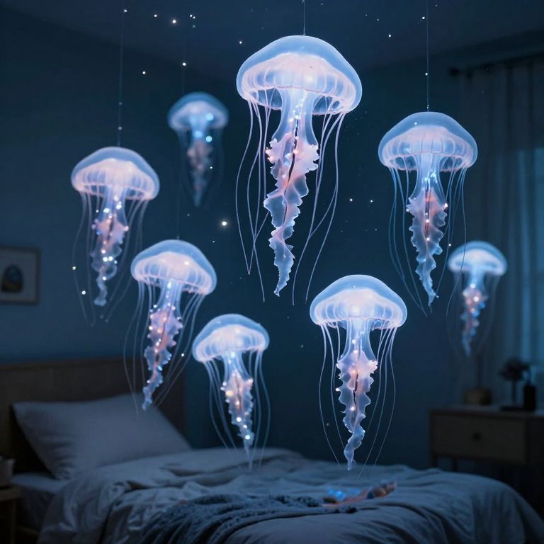 Photograph of glowing blue jellyfish lanterns hanging above a dimly lit bedroom with a bed, pillows, and a nightstand.