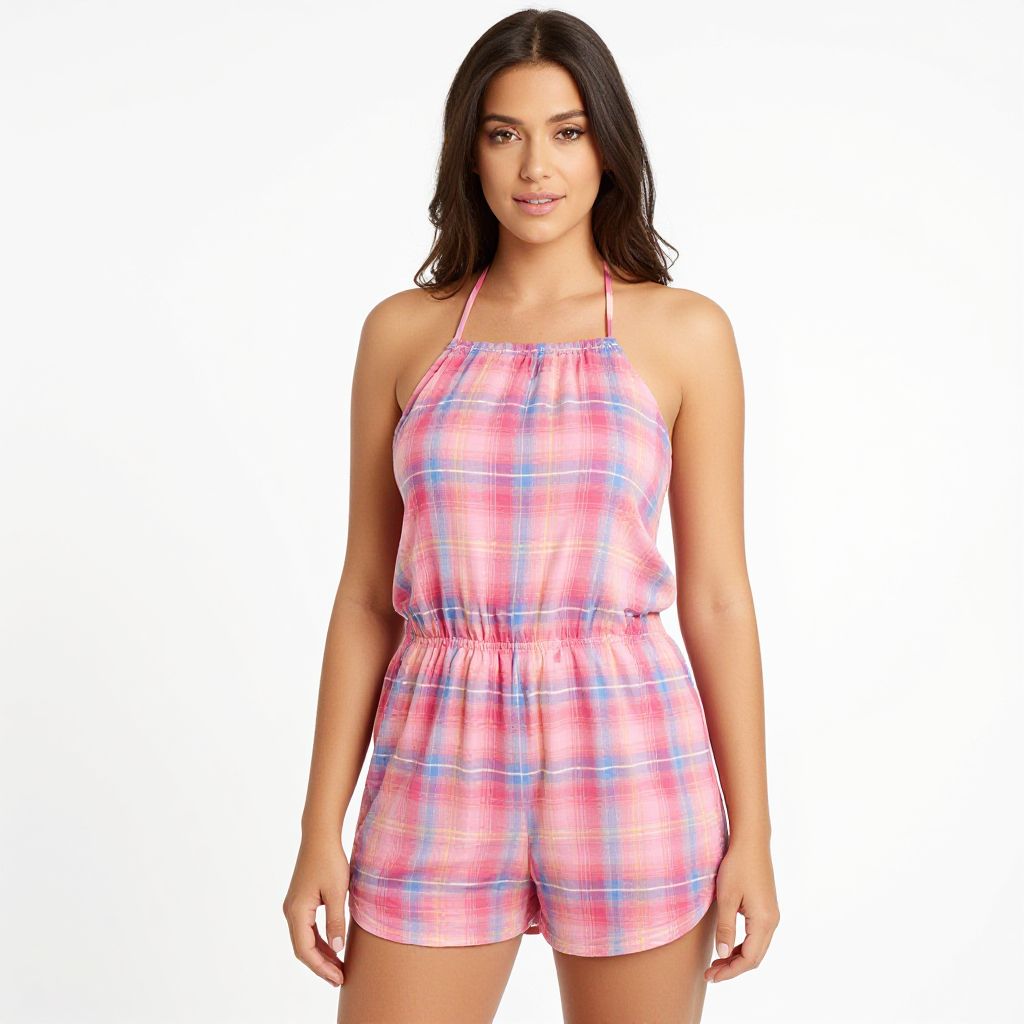 "Woman, casual, halter neck romper with a plaid pattern in pink, blue, and yellow hues, sleeveless, relaxed fit, short-length, white background.. Sexy. Pretty face and beаutiful eyes. Big breasts."