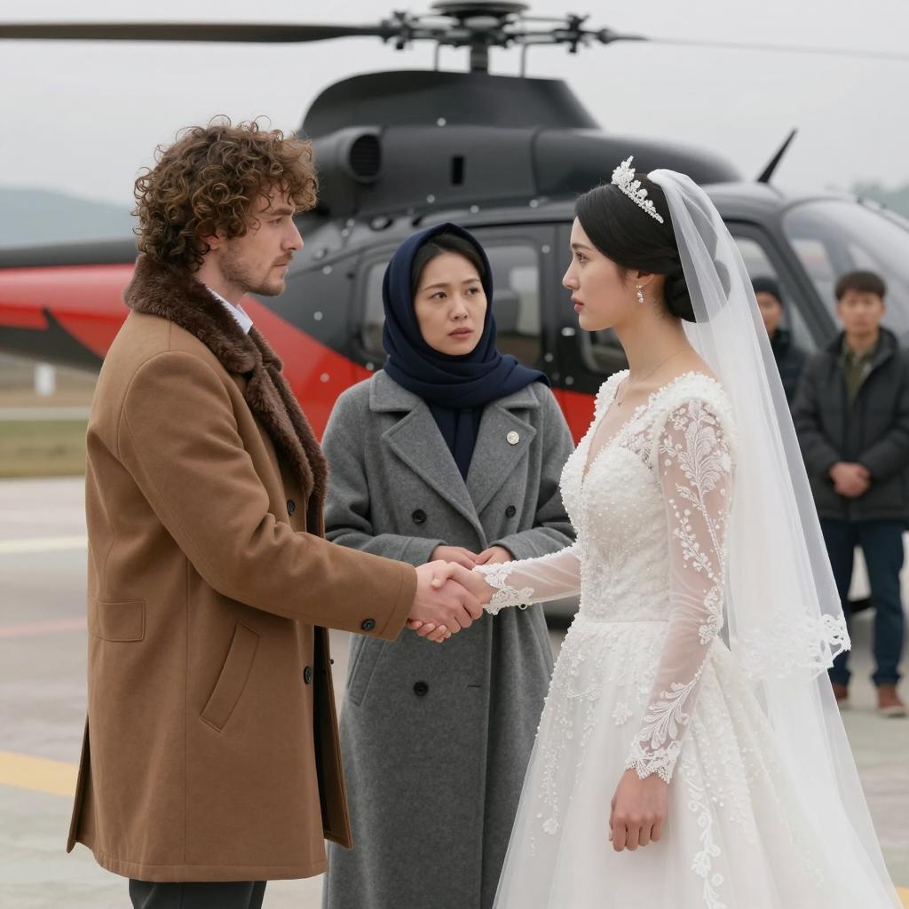 A man with curly hair wearing a brown coat with a fur collar shakes hands with a woman dressed in an elegant white wedding dress with lace details and a veil. Another woman in a gray coat and dark headscarf stands between them, holding the bride's arm. They are outdoors on a helipad with a black and red helicopter in the background. The atmosphere appears serious and tense.