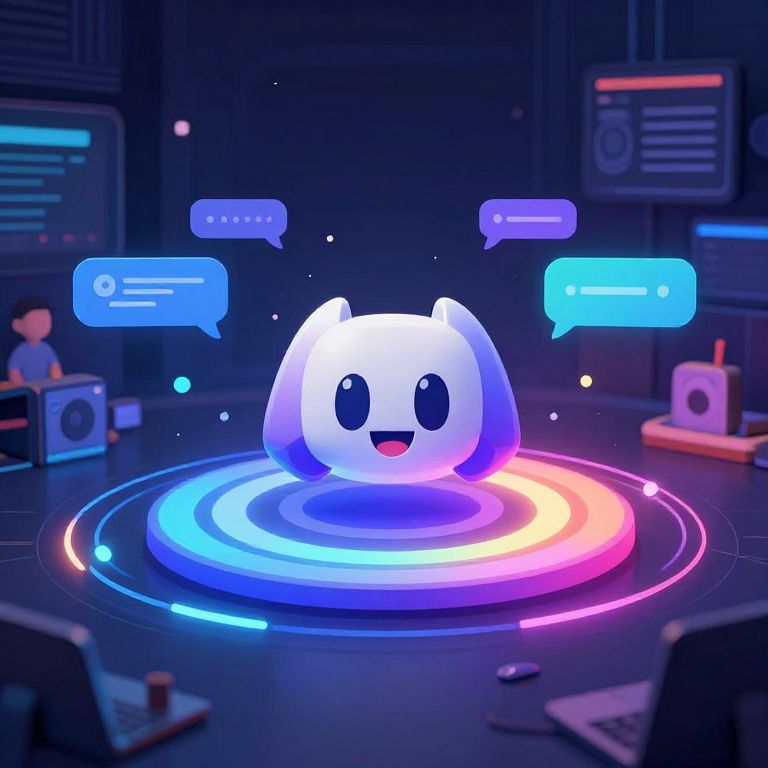 A creative scene featuring a Discord harmony bot at the center of a virtual chat room, radiating colorful harmony rings symbolizing unity and cooperative communication, futuristic UI elements, sleek design, and vibrant digital effects.