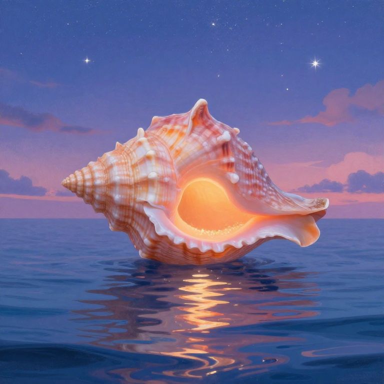Photorealistic digital art of a glowing, orange-hued seashell floating on calm ocean water at twilight, with a starry, pink-h